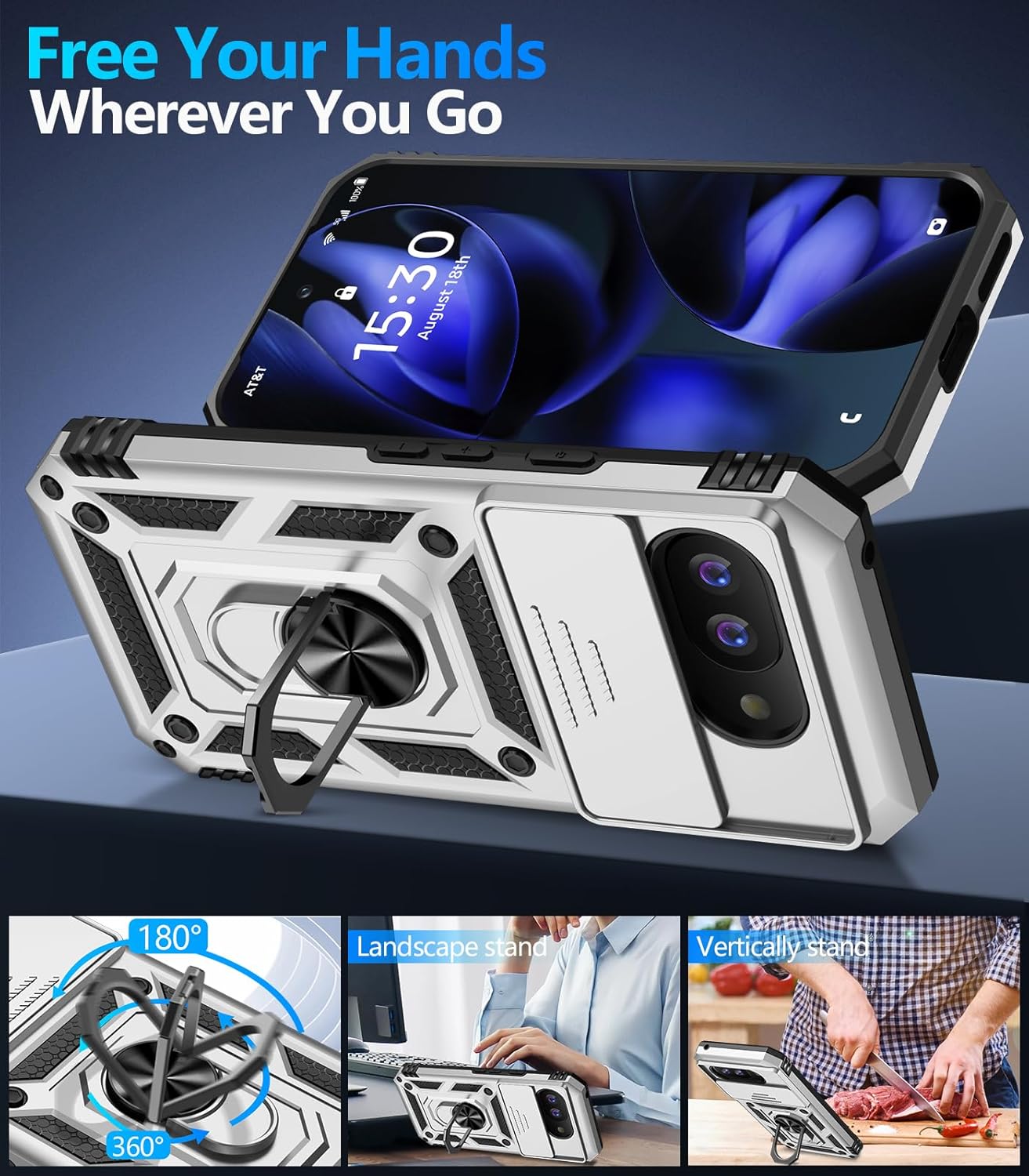 Taisairu for Google Pixel 9A Case with Screen Protector & Slide Camera Lens Cover, Built-in 360°Rotate Magnetic Ring Stand Shockproof Protective Phone Case for Google Pixel 9A Case (Silver)