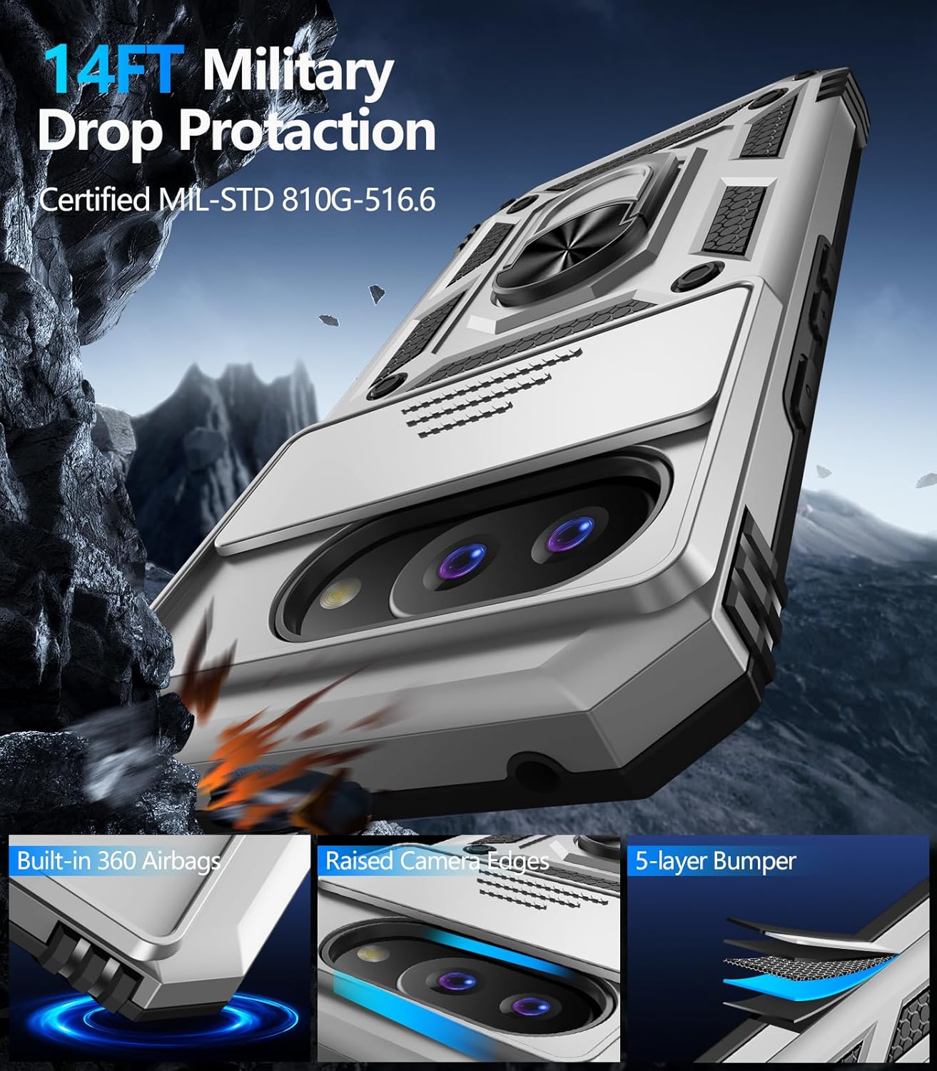 - 【Full Body Protection】For Google Pixel 9A Phone Case is military-grade drop protection. It has exclusive Shock 360° airbags around edges and strong TPU rubber bumpers on the outside edges for shock absorption if dropped. The internal air pad corners as bumpers are rounded and bubble out safely, giving extra room against corner shattering. What's more, Slide Camera Lens Cover, 1.5 mm bezels over the screen and 0.5 mm raised corner lips on the back provides extra and comprehensive protection.
