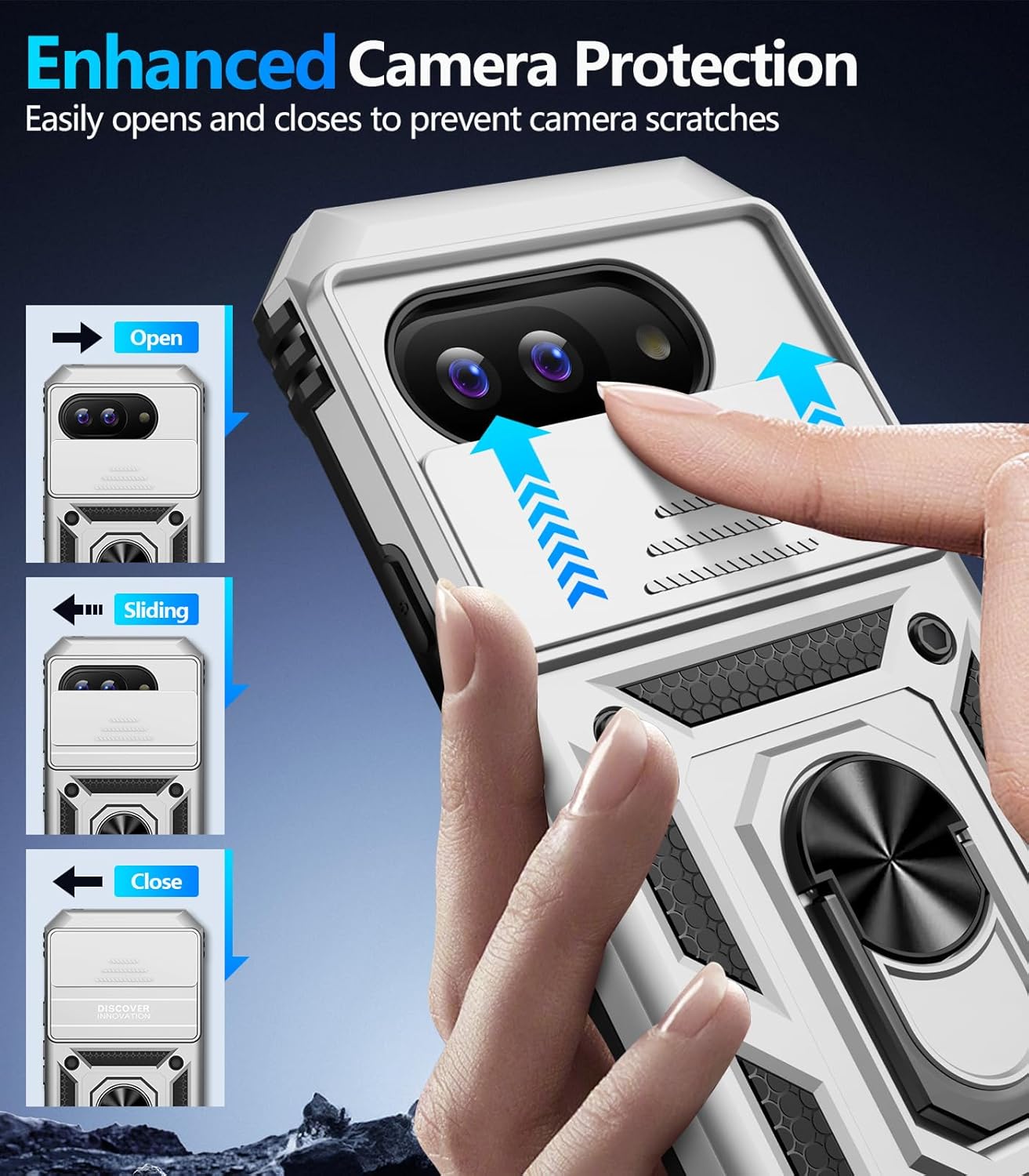 - 【Slide Camera Lens Cover】For Google Pixel 9A Phone Case with Slide Camera Lens Cover protect your phone camera lens against scratches,collision, scrapes. The camera Lens cover features grooved track for a smoother sliding experience, it can slide smoothly up and down, and the slide cover for the camera can snaps in place to lock in the open position and closed position, no worry about the camera lid will be loose or fall off, you can get a nice,clear picture because you always have a clean lens.