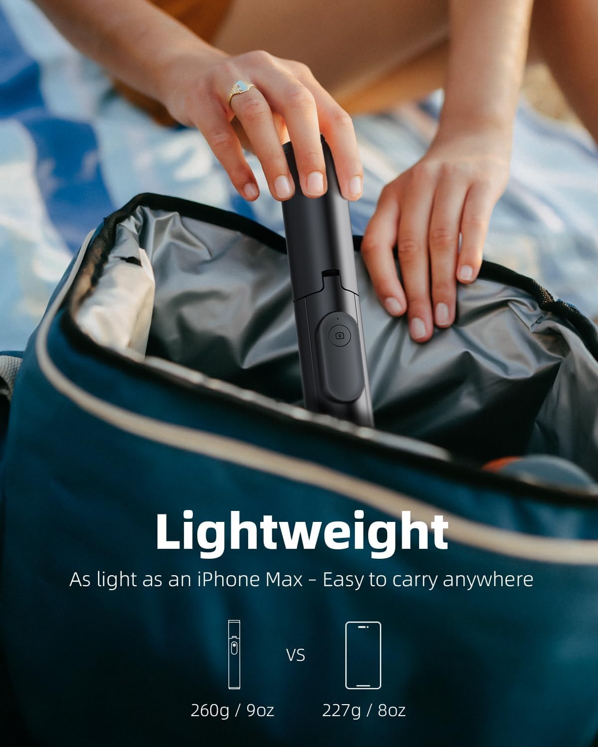 - Selfie Stick Tripod All-in-One Design: This lightweight Phone tripod weighs only 9oz (260g) and features an integrated design for ultimate portability. Effortlessly fold it in seconds and take it anywhere with ease, making it the perfect travel companion.