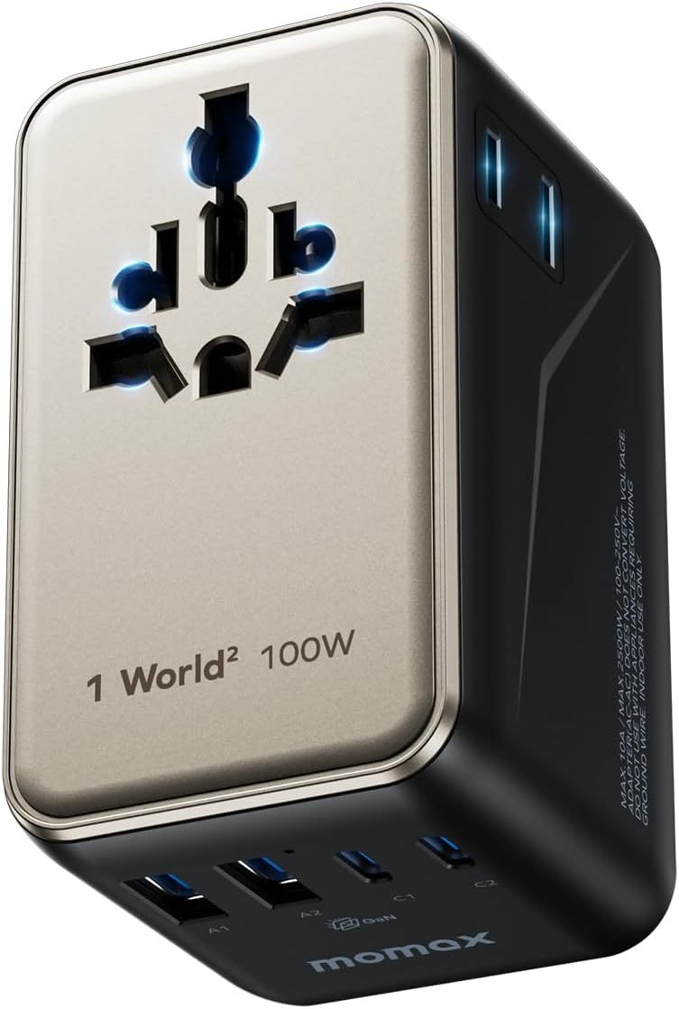 - PD 100W Fast Charging, Advanced GaN Technology - With 2 USB-C ports, 2 USB-A ports and 2 AC outlets (up to 2500W), this universal travel adapter supports PD 3.0 and QC 3.0 fast charging. One of the USB-C PD ports is capable of ultra-high speeds of up to 100 W. MOMAX's advanced Gallium Nitride technology compresses this conversion adapter into a surprisingly compact size and light weight with additional ports, faster charging speeds, and cooler temperatures