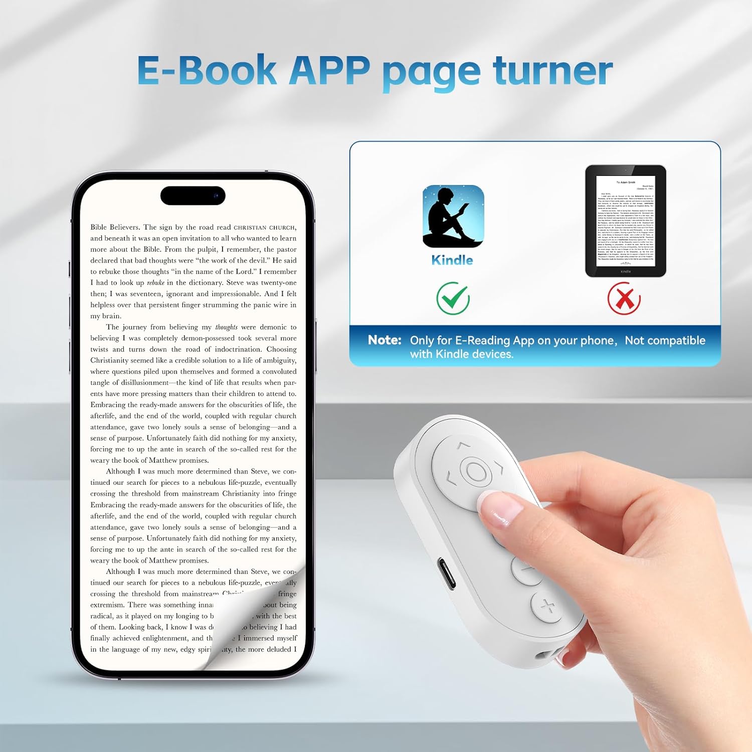 - 【E-Book App Page Turner】This wireless remote can help you control the page-turning of the E-book APP, and enjoy a comfortable reading experience. Note: ONLY available for e-book APP on Smartphone, not work for Kindle devices or any E-reader device.