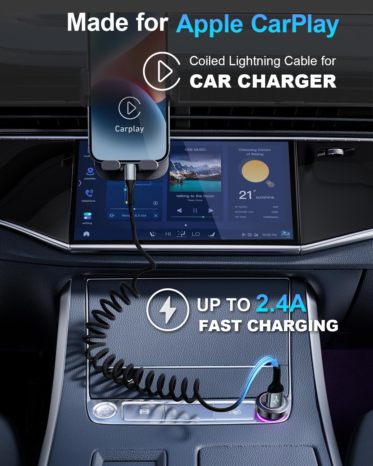 - iPhone Charging Cable Coiled: This coil cable is designed with retractable spring design, no tangle, no knot, not taking up space and easy to carry and use. The automatic rebound design for car charging saves space on the center console and avoids clutter. It is perfectly compatible with CarPlay and charges quickly.