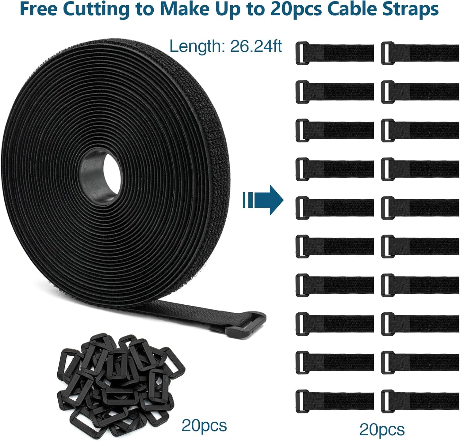 26ft Cut-to-Length Cable Straps 1in Wide with 20pcs Plastic Buckles, Adjustable Cinch Strap Free Cutting, Reusable Hook and Loop Straps for Fastening Cable Ties, Cord Straps, Wire Management