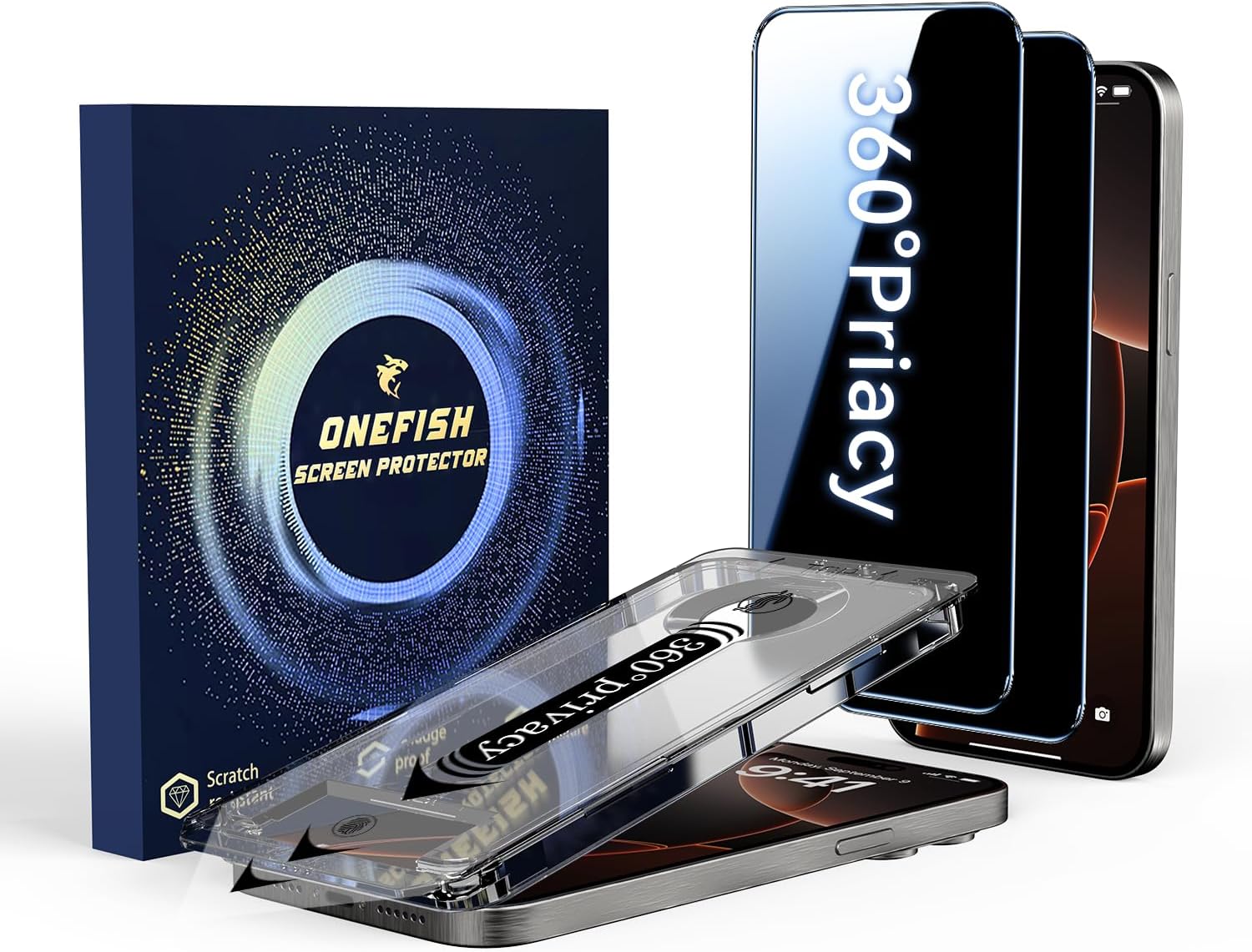 - 【360° Anti-Spy Protection】OneFish for iPhone 15/16 Privacy Tempered Glass utilizes cutting-edge optical color-free anti-peep technology. 4-way privacy shielding prevents side/upper/lower visual hacking while maintaining HD clarity (30% brighter transmittance). Your screen stays crystal-clear to you but appears completely dark to others - no color distortion, no grainy mesh effect.