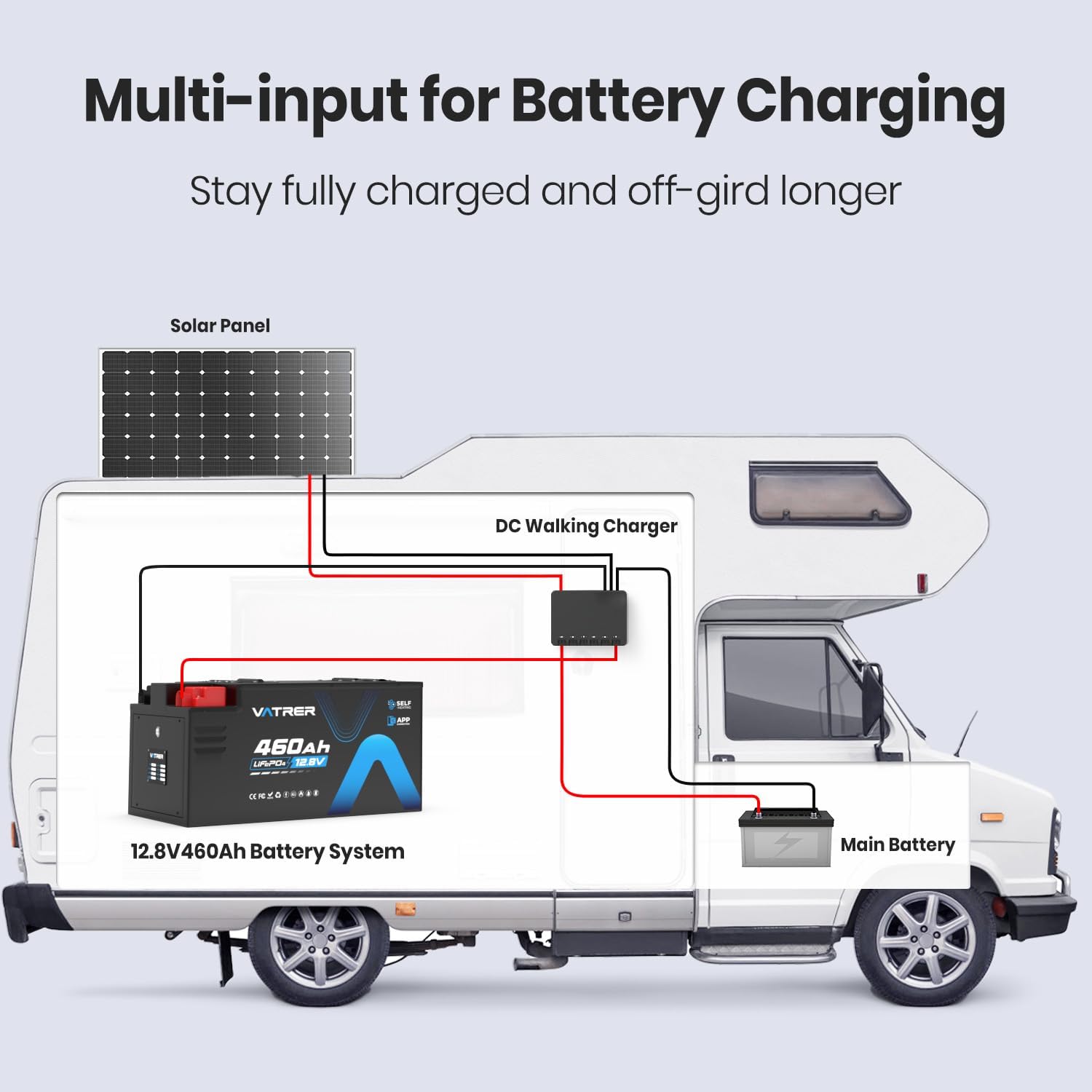 12.8V 460Ah Low Temp Cutoff LiFePO4 RV Battery, APP Monitoring, Built-in 300A BMS, Max. 3840W Load Power, 5880Wh Usable Energy, VATRER POWER 5000+ Cycles Lithium Battery, Perfect for RV, Motorhomes