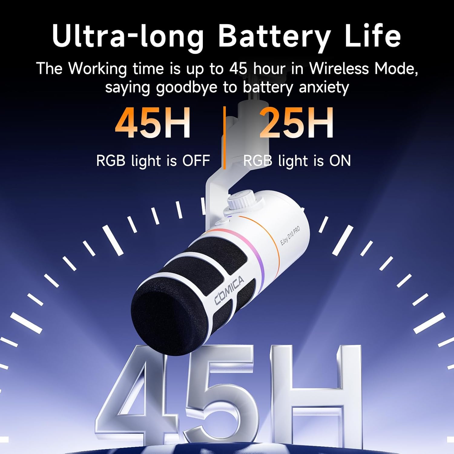 - Battery Life Up to 45 Hours in Wireless Mode:EJoy D10 PRO wireless RGB microphone supports long battery life and charging during using. In wireless mode, the battery life can last up to 45 hours. Users can fully focus on content creation without worrying about battery power. EJoy D10 PRO has optional boom arm and desktop stand, this one is a boom arm.