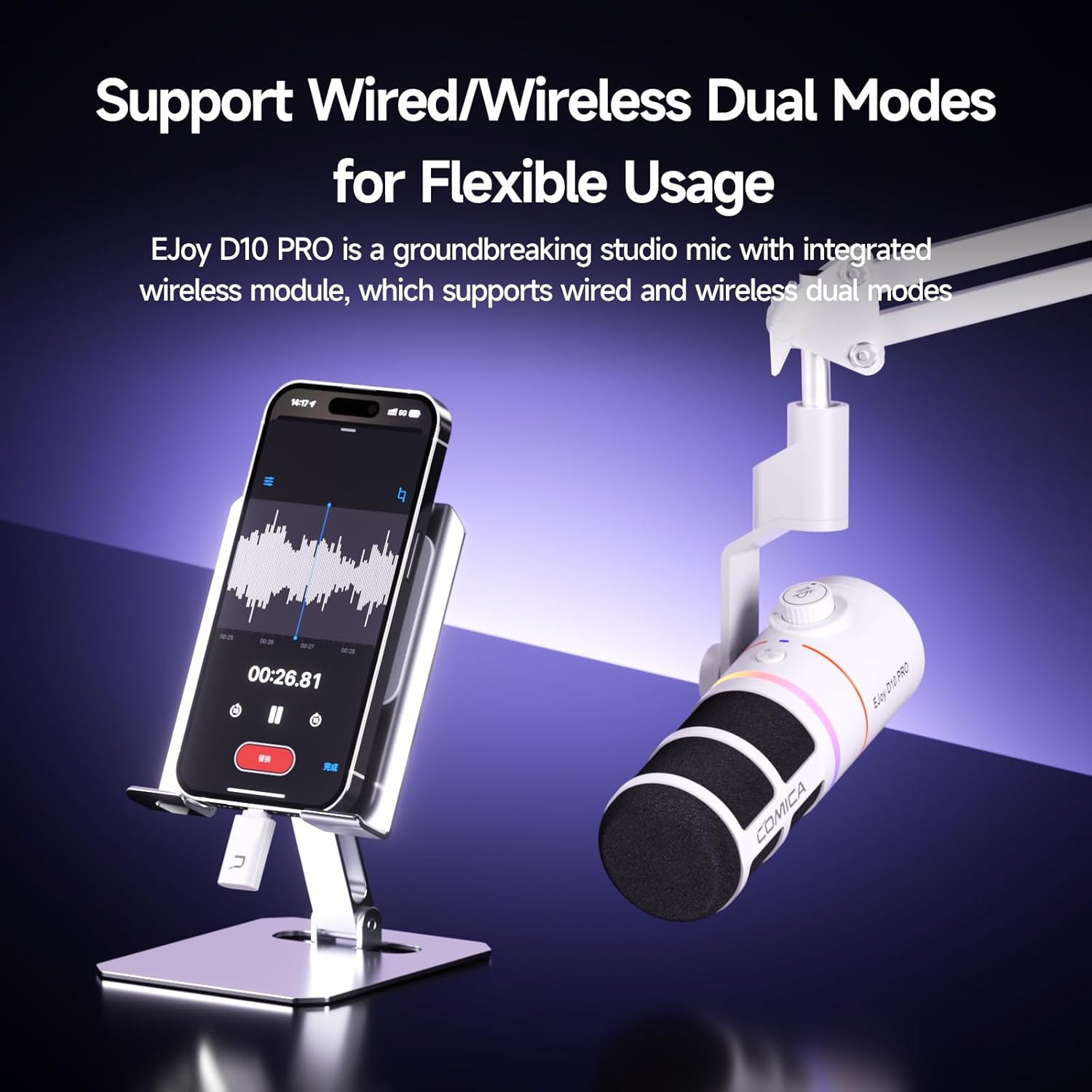 EJoy D10 PRO(A) USB Wireless Gaming Microphone – Boom Arm Mic with Wired/Wireless Modes, XLR/USB-C, Real-Time Monitoring, 45H Battery, RGB Dynamic Mic for Gaming, Streaming, Podcast, Recording (White)