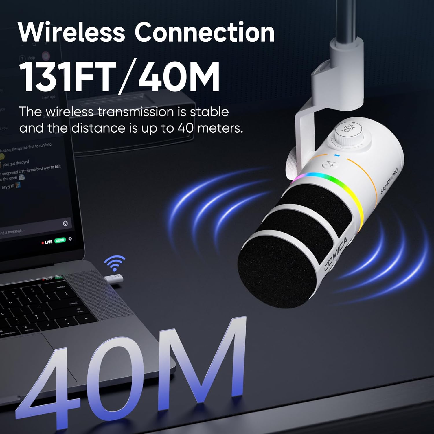 - Wired & Wireless Flexibility:Comica EJoy D10 PRO is a professional studio microphone that supports wired/wireless dual modes and can switch seamlessly between wired and wireless modes. In wireless mode, EJoy D10 PRO wireless gaming microphone supports 40 meters of stable transmission, which is more convenient to use and can meet different recording and live broadcasting needs.