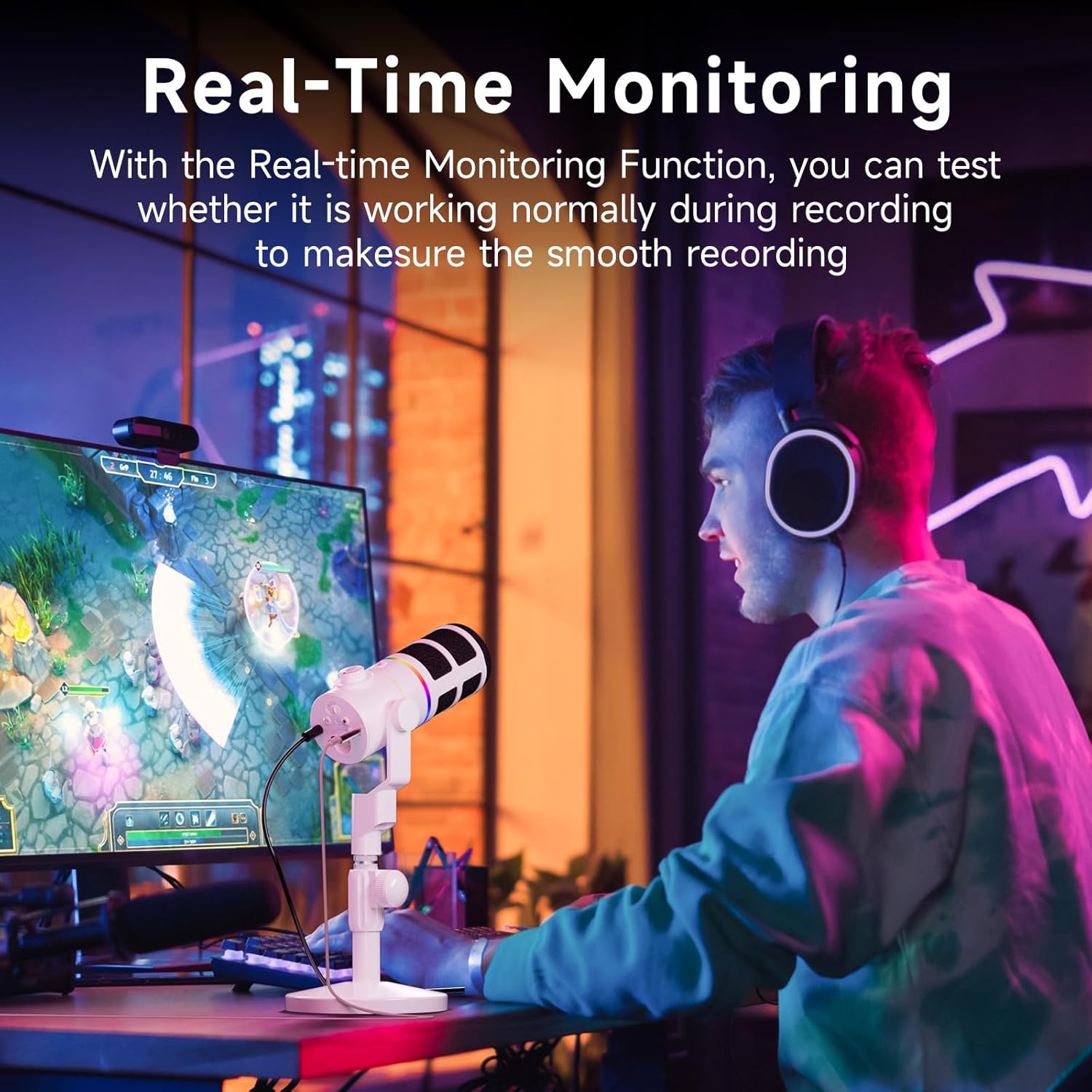 - Dynamic Radiant RGB Light:Short press to adjust Audio Dynamic/Comica Orange/ Sea Wave/Colorful Breathing Light/RGB Slow Wave/Rotating Rainbow six RGB light effects. Vibrant RGB lights ignite an incredible live stream atmosphere. Short press to switch bass, nature or bright three kinds of EQ effects, this RGB dynamic mic bringing you different gaming and streaming experiences.