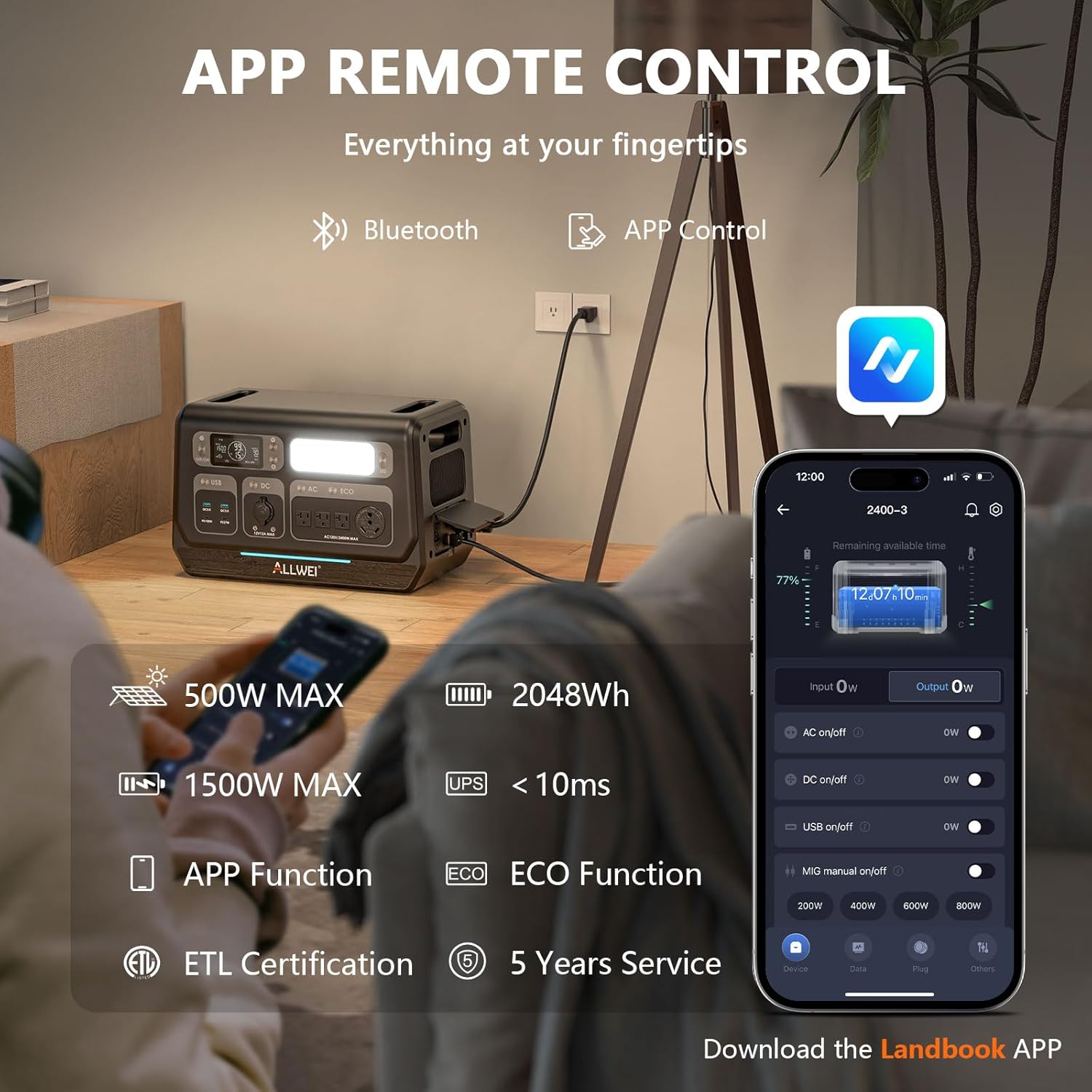 - 【Expandable Capacity】ALLWEI 2400-3 electric generator supports up to 4 expandable battery packs from 2048Wh to 10240Wh with ALLWEI SGR-B200 PRO(Sold Separately), enough to juice up all hungry devices.