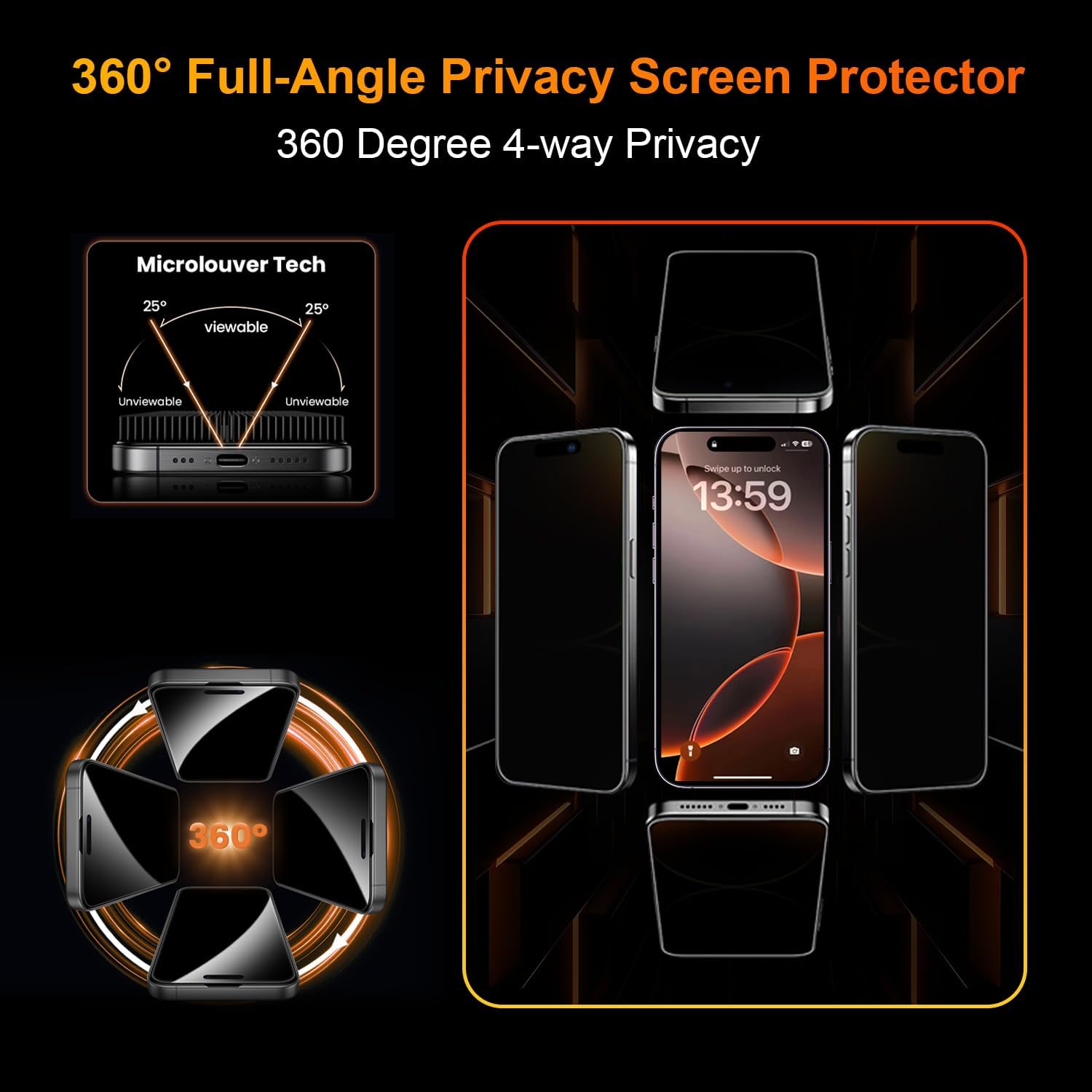 OneFish 2 Pack Privacy Screen Protector for iPhone 16 Pro - 4-Way 360° Anti-Spy Tempered Glass, 9H Hardness, 3D Curved Edges, Case-Friendly & Easy Installation