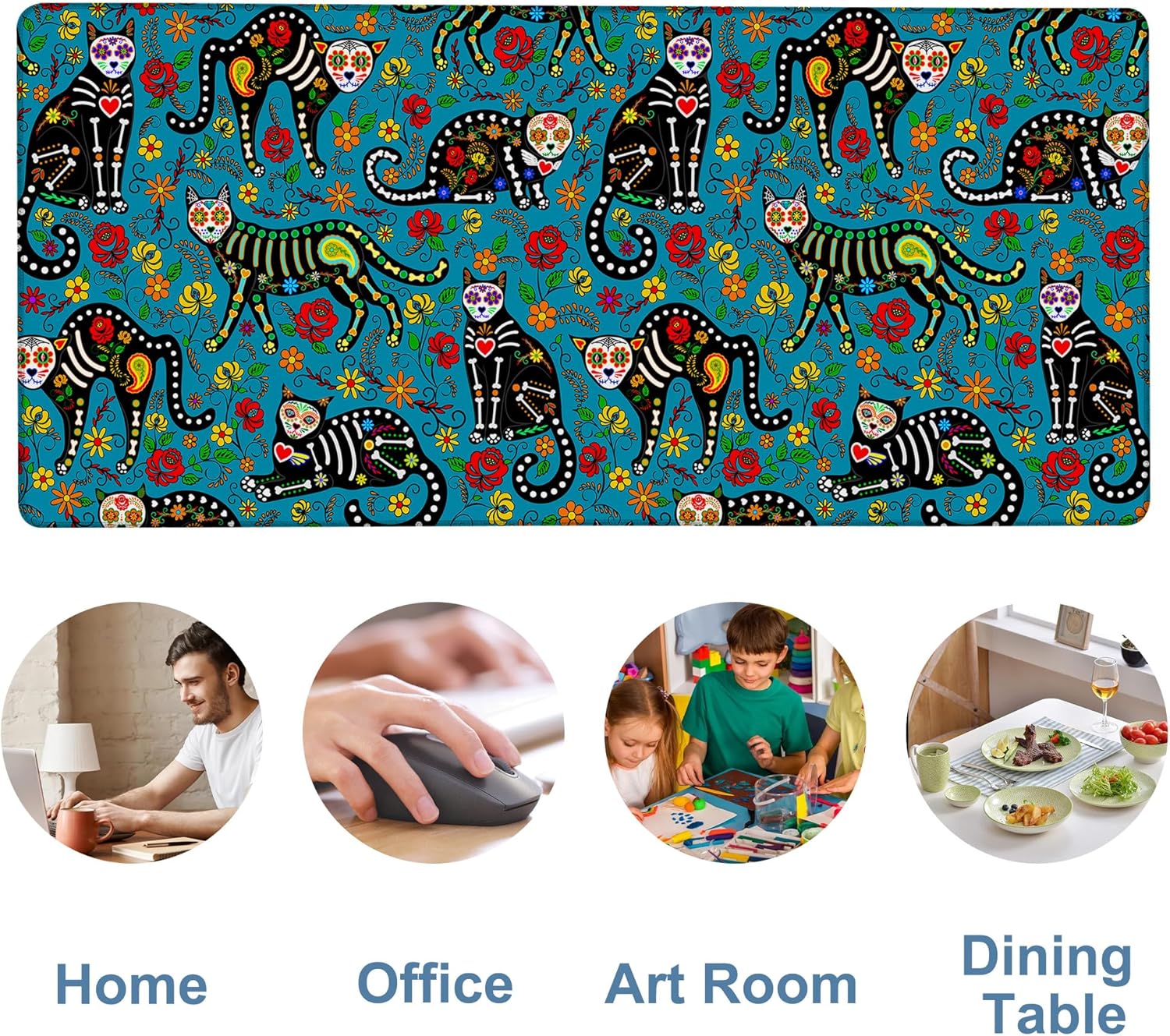 Sugar Skull Black Cats Gaming Mouse Pad 3mm Thick Stitched Edge Waterproof Non-Slip Large Computer Keyboard Mouse Mat,Suitable for Office Entertainment Decorative Desk Pad 35.4 x 15.7 Inches