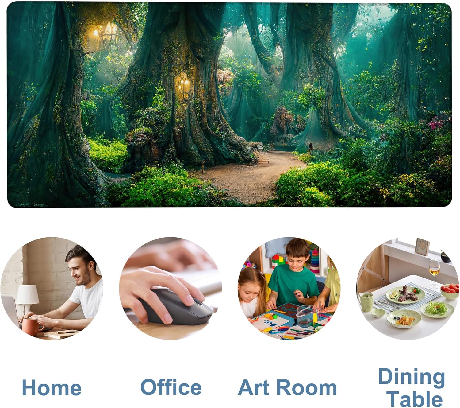 Gaming Desk Pad Large Extra Length Mysterious Forest Mouse Pad Keyboard Laptop Non-Slip Waterproof with Rubber Base Thick Stitched Edge Mouse Mat for Office Home 35.4 x 15.7 Inches