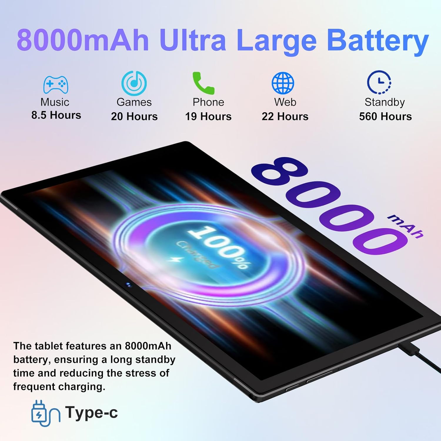 - 【8000mAh Large Battery and Versatile Cameras】 The tablet is powered by an 8000mAh battery, providing extended usage for work, study, or entertainment. It also features a 5MP front camera and an 8MP rear camera, perfect for capturing photos and making video calls.