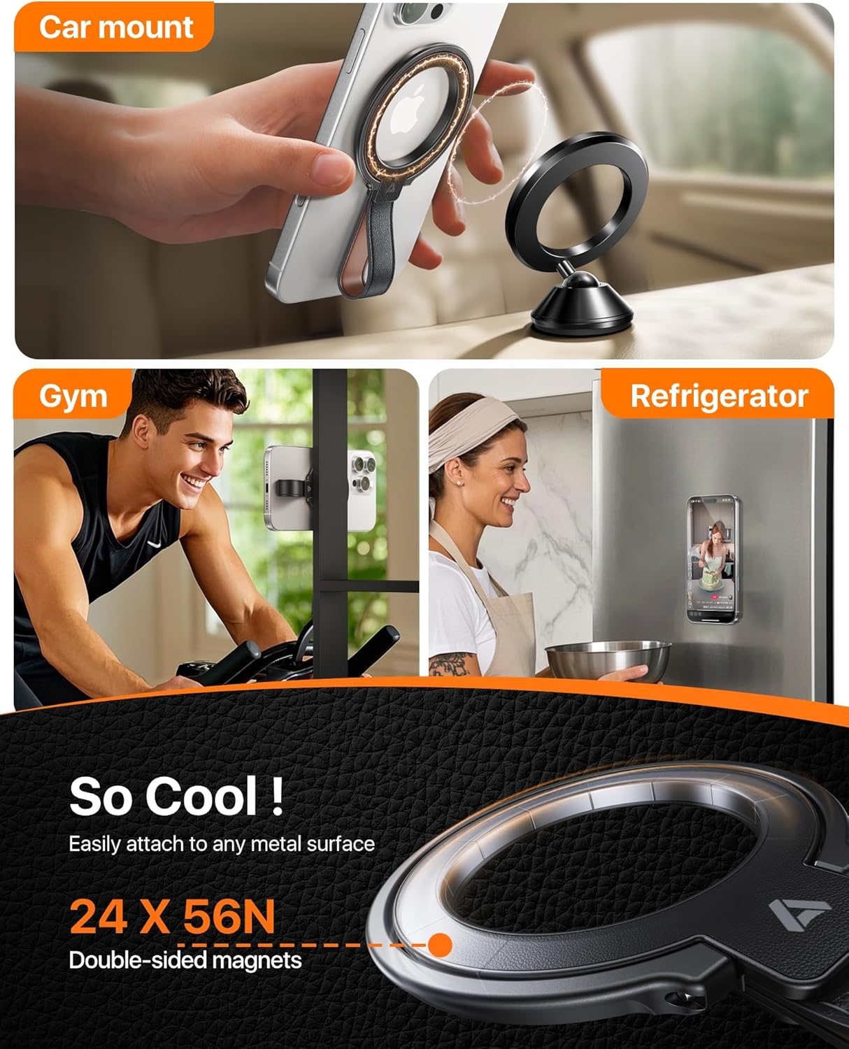 - [Ultra-Strong Dual-Sided Magnet – Lock It, Grip It, Never Drop It] We crafted this magnetic phone ring holder with an innovative dual-sided magnetic system featuring 24 premium N56 magnets that deliver a powerful 30N magnetic force. It securely snaps onto your MagSafe iPhone/cases, while the outer magnetic surface easily attaches to gym equipment, refrigerators, car mounts, or any magnetic metal surface—no need to remove the ring. Whether you're multitasking in the kitchen, watching videos at the gym, or navigating in the car, it keeps your hands free and your phone firmly in place with style and ease