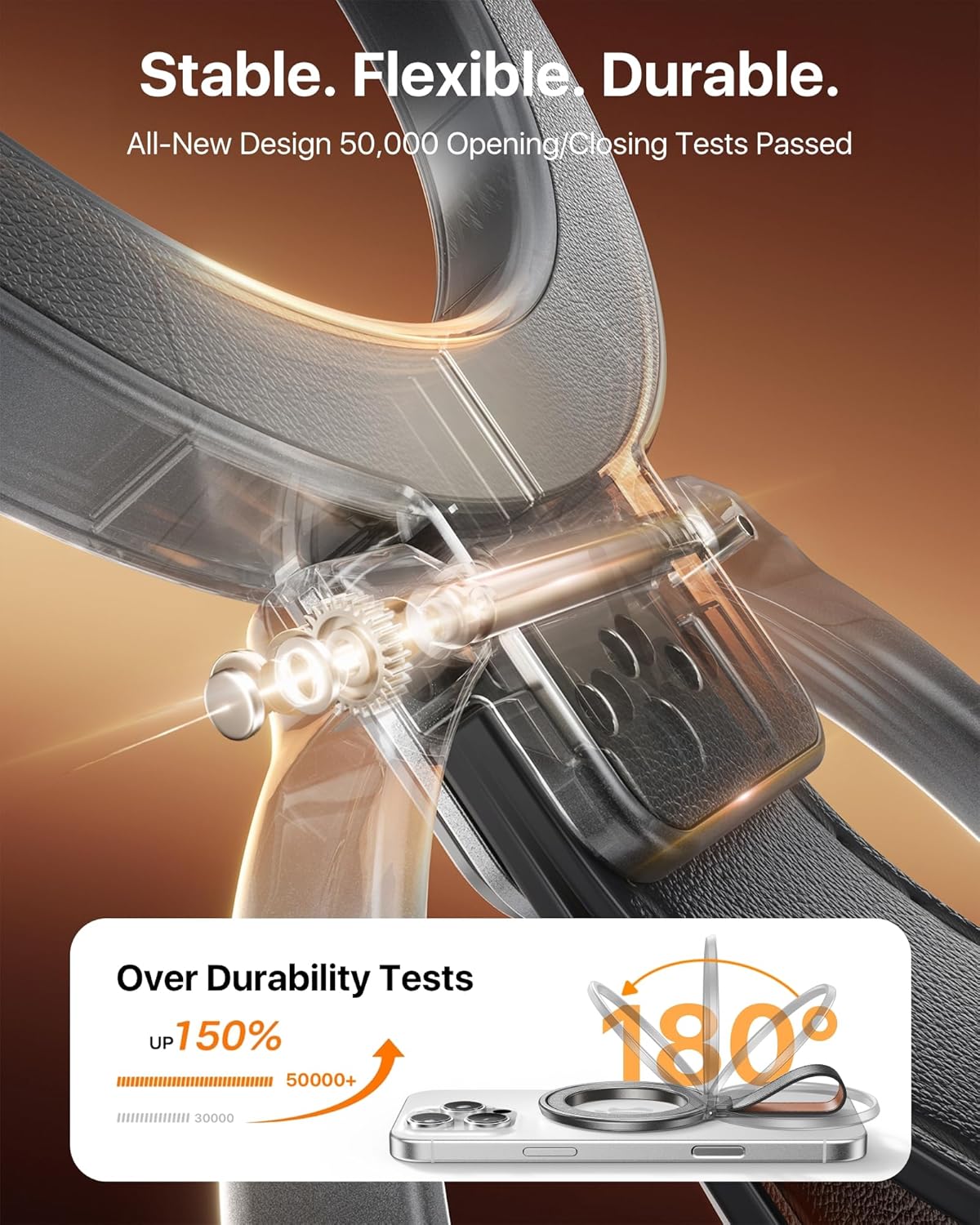 - [Upgraded Hinge System – Smooth Open & Military-Grade Durability] We crafted our MagSafe ring grip with a premium zinc alloy hinge and precision-tuned resistance, delivering ultra-smooth, effortless angle adjustments with every flip. It withstands over 50,000 open/close cycles without loosening, ensuring long-lasting durability and flawless positioning for both portrait and landscape views. Whether you're binge-watching, video calling, or multitasking, this magnetic phone holder guarantees reliable performance day after day