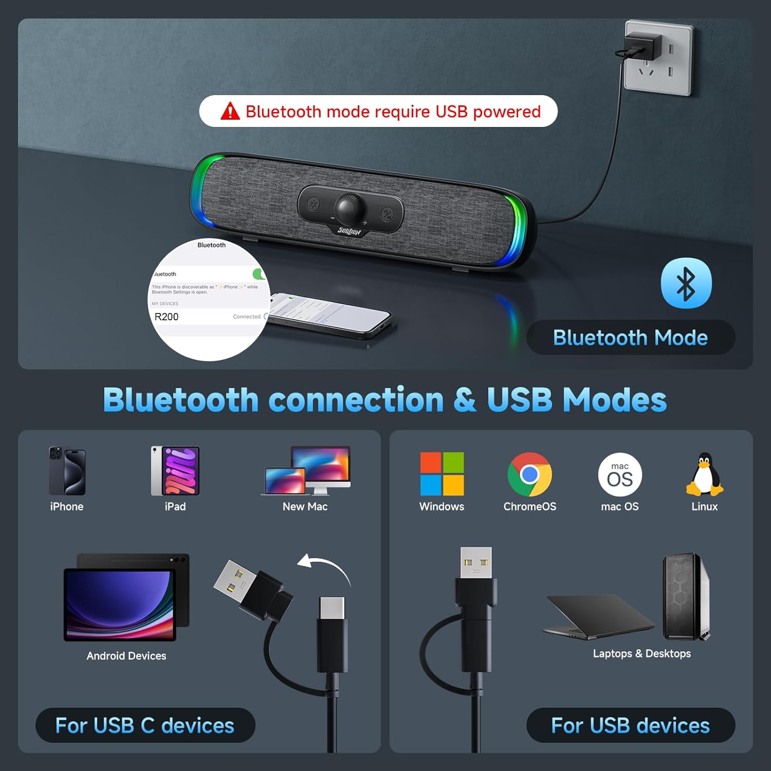 SOULION R200 Bluetooth Computer Speakers, Compact PC Speakers, USB C/USB Plug & Play Desktop Speaker with Colorful LED Lights, Clear Sound PC Soundbar for Computer Desktop Laptop Monitor