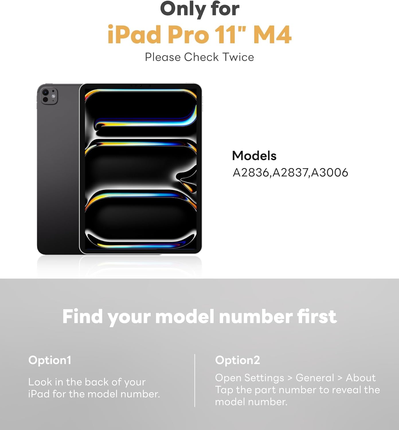 - 📘Compatibility - For iPad Pro M4 11” 2024, Model Number: A2836, A2837, A3006. ❗【Find Your Model】: Setting → General → About → Model Name and number