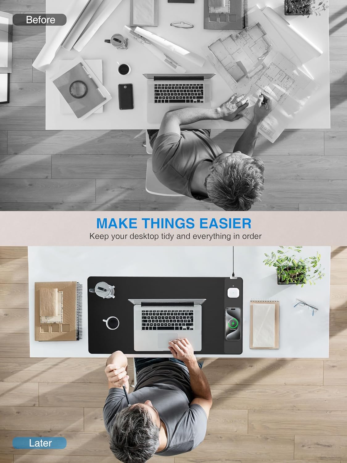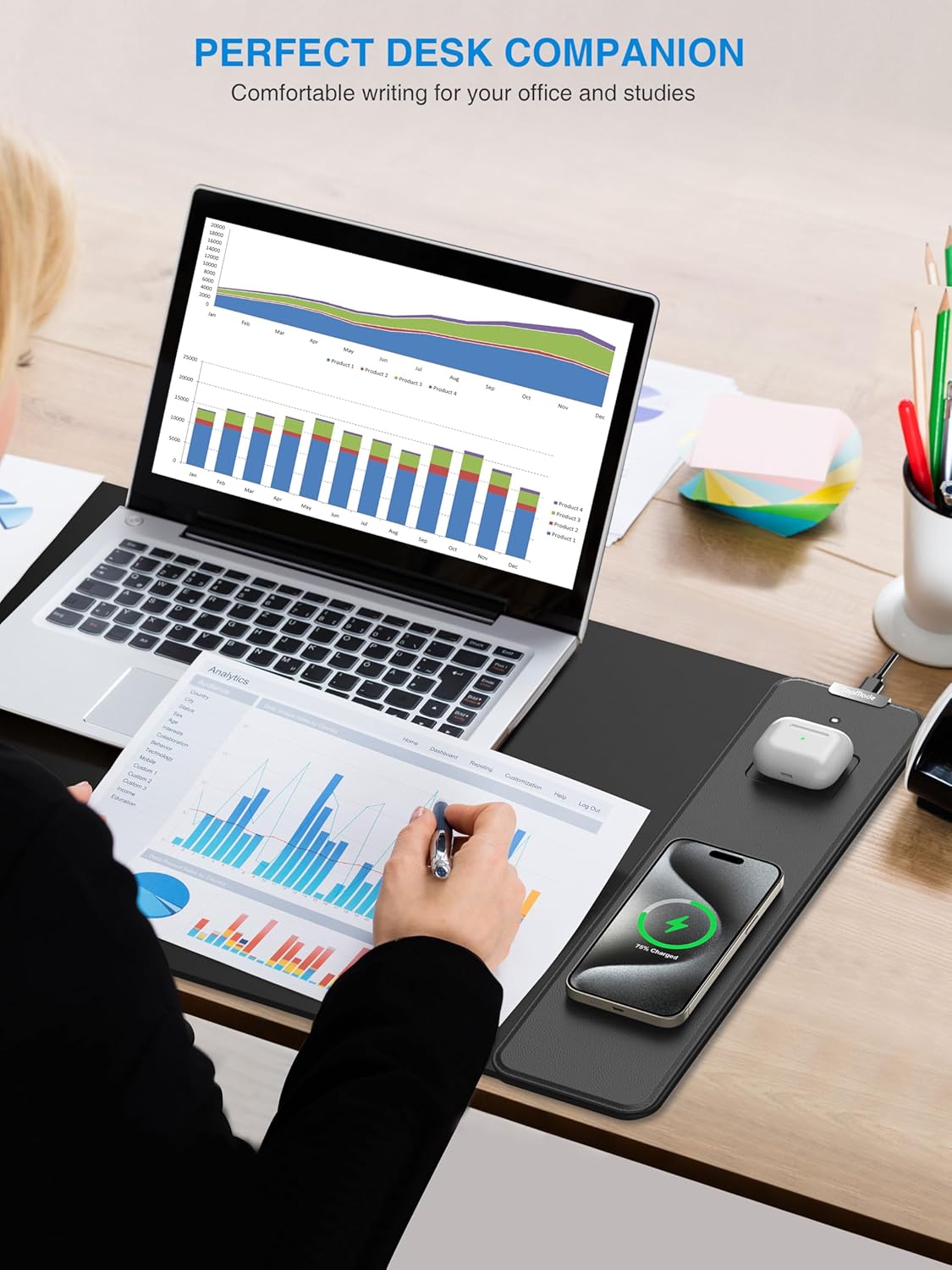 - 【Extra Large 3-IN-1 Wireless Charging Mouse Pad for Desk】 TopMade extended mousepad is 31.5" x 15.75", the extra large usable area covers your desk keyboard, mouse, and other items while gaming or working, and combines 3 functions of phone charging, AirPods charging, and mouse pad in one, allowing you to charge your iPhone and AirPods while using the gaming mousepad without the need for additional cables interfering with your desk, keeping your desk neat and tidy