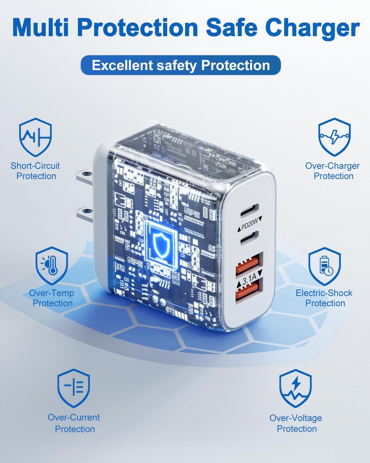 - 【Multiport Charging Block】: 2Pack 4-Port fast usb c brick design with 2 USB-C ports and 2 USB-A ports. Allow users to charge phone tablets, cameras, power banks, and various devices, simultaneously to minimize waiting time. It’s also a great space saver instead of taking up 4 wall outlet ports. The best replacement for your original usb charger