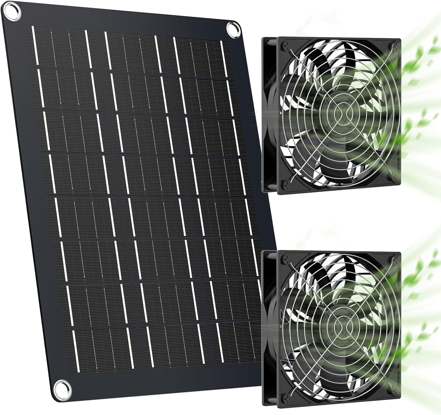 - 2 FANS FOR LARGER AIRFLOW: This solar panel and fans set delivers greater airflow under the same sunglight conditions compared to similar products. Powered by a high-efficiency 15W monocrystalline solar panel 15W, the fans can reach a maximum speed of 2,500 RPM, ensuring effective ventilation.