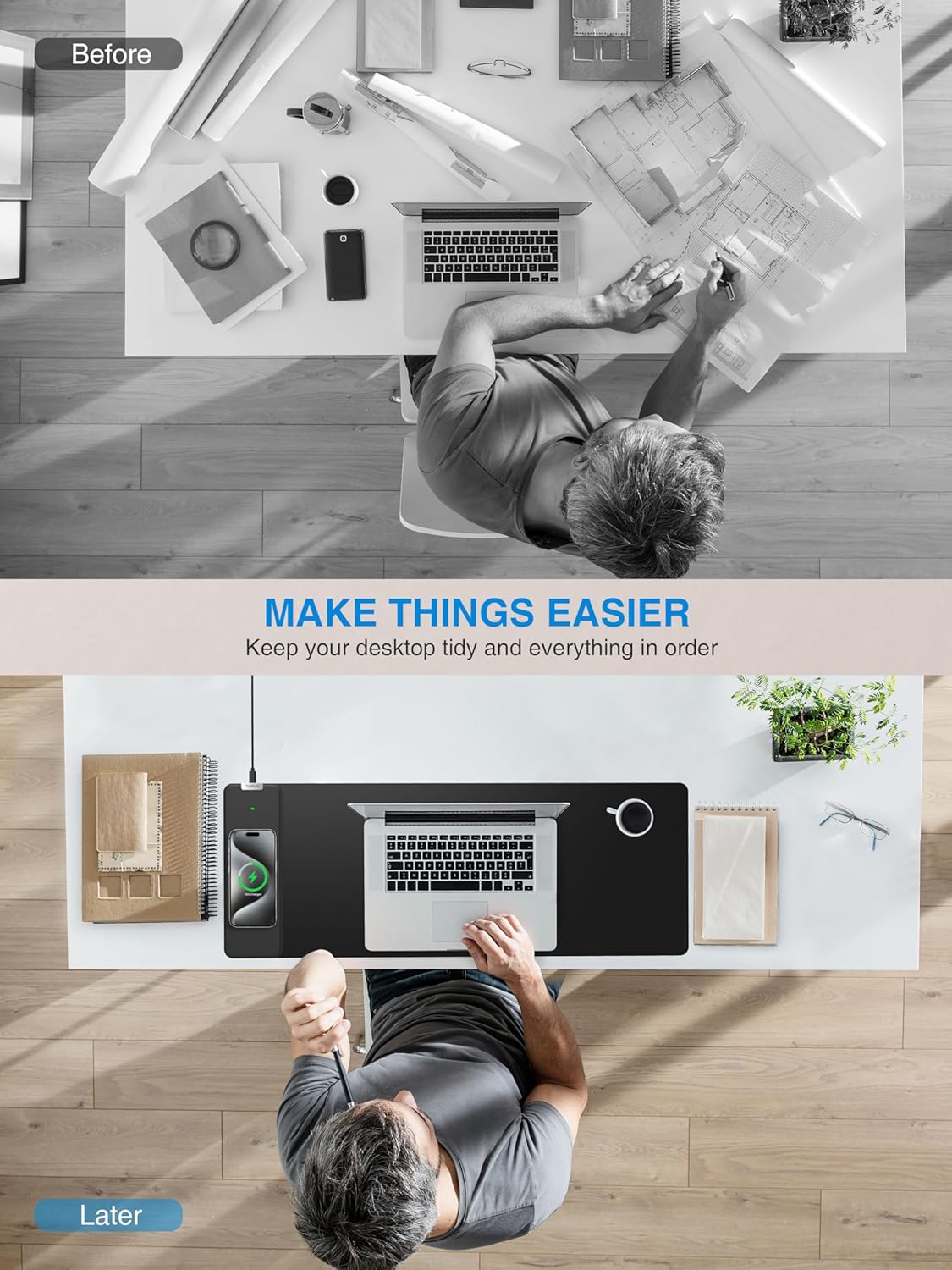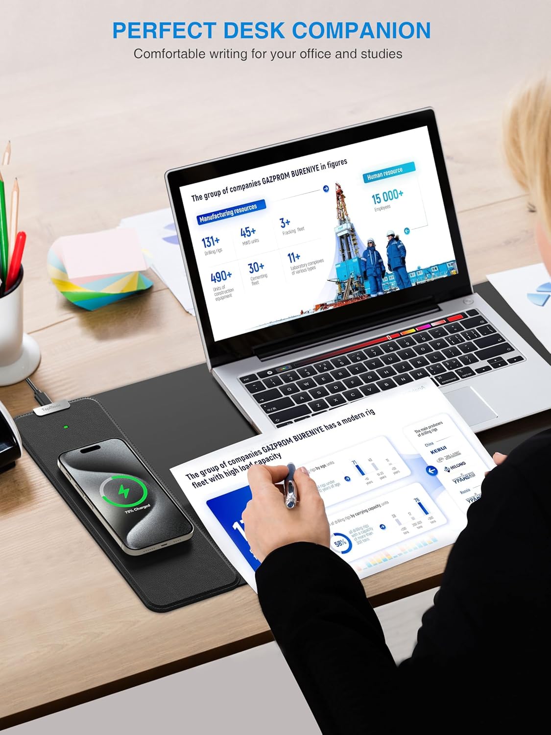 - 【XL Large 3-IN-1 Wireless Charging Mouse Pad for Desk】 TopMade XL mousepad is 31.5" x 11.81", the extra large usable area covers your desk keyboard, mouse, and other items while gaming or working, and combines 3 functions of phone charging, AirPods charging and mouse pad in one, allowing you to charge your iPhone or AirPods while using the gaming mousepad without the need for additional cables interfering with your desk, keeping your desk neat and tidy
