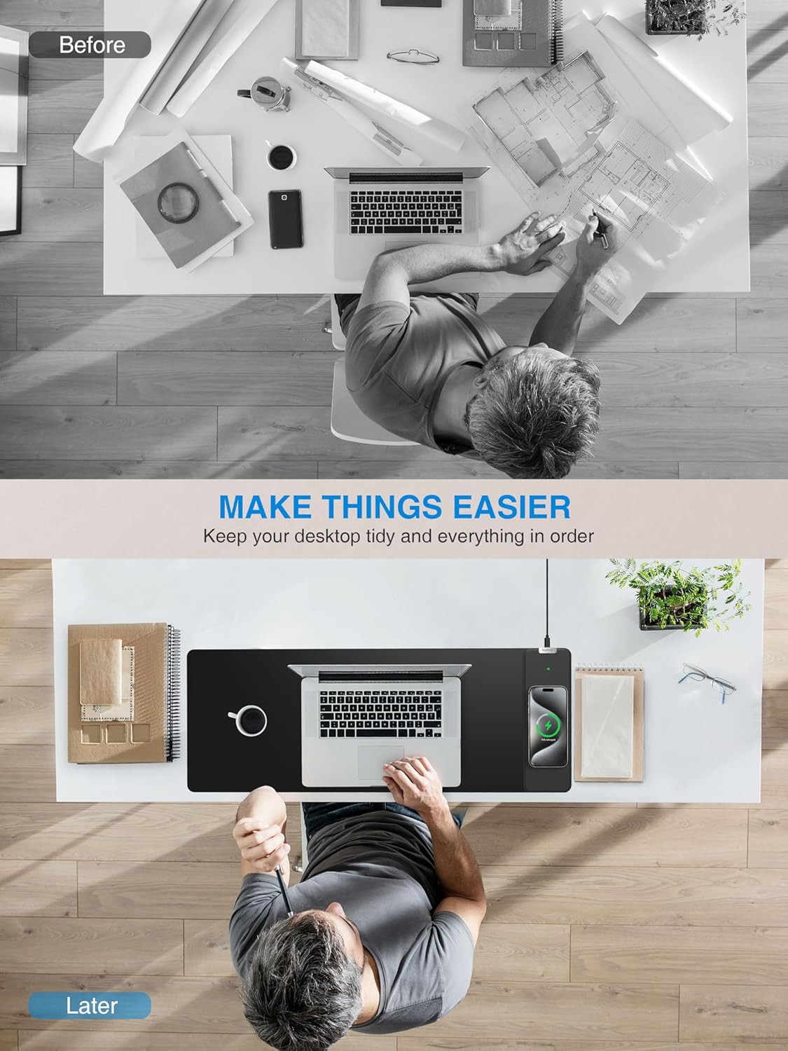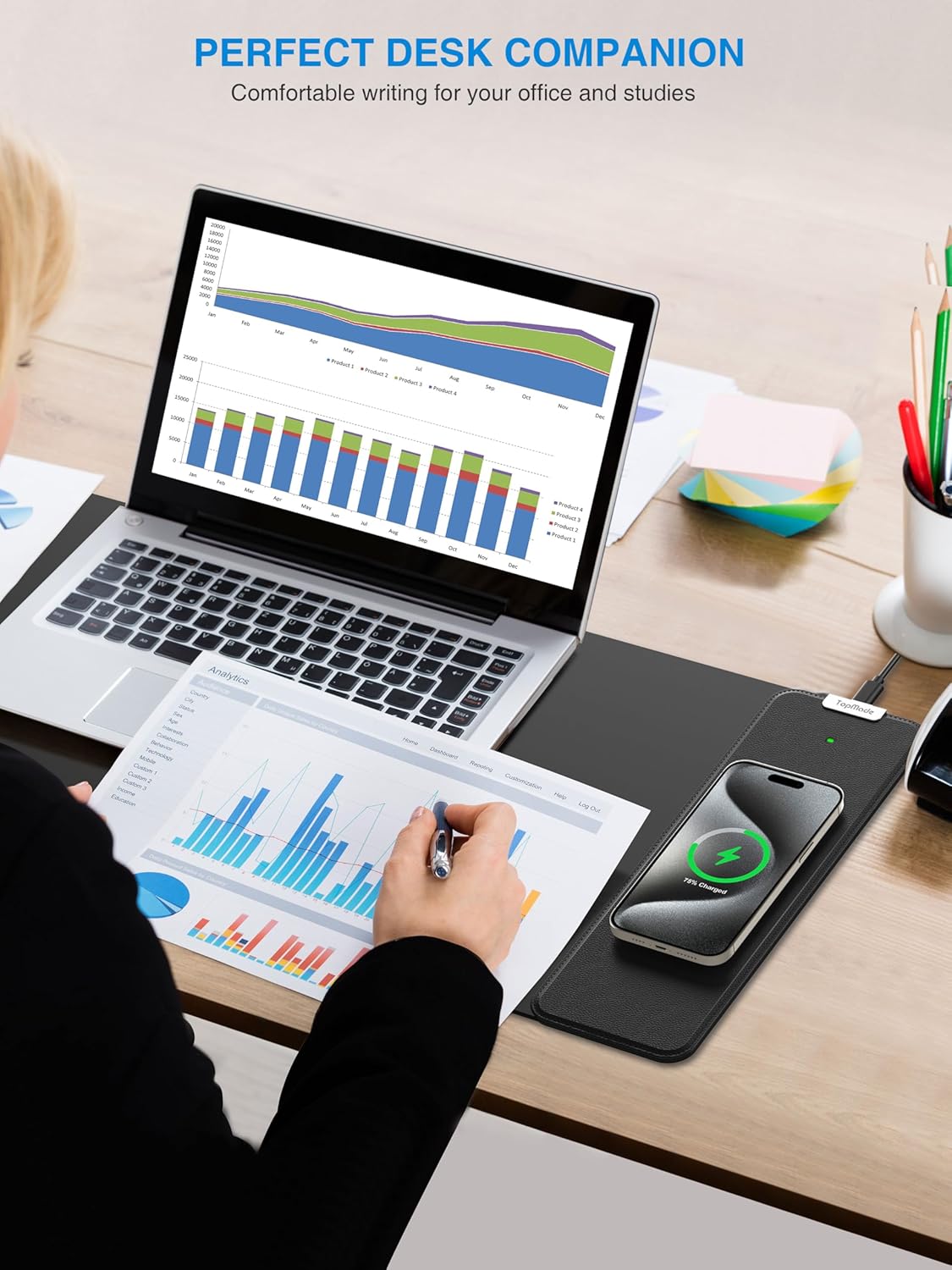 - 【XL Large 3-IN-1 Wireless Charging Mouse Pad for Desk】 TopMade XL mousepad is 31.5" x 11.81", the extra large usable area covers your desk keyboard, mouse, and other items while gaming or working, and combines 3 functions of phone charging, AirPods charging and mouse pad in one, allowing you to charge your iPhone or AirPods while using the gaming mousepad without the need for additional cables interfering with your desk, keeping your desk neat and tidy