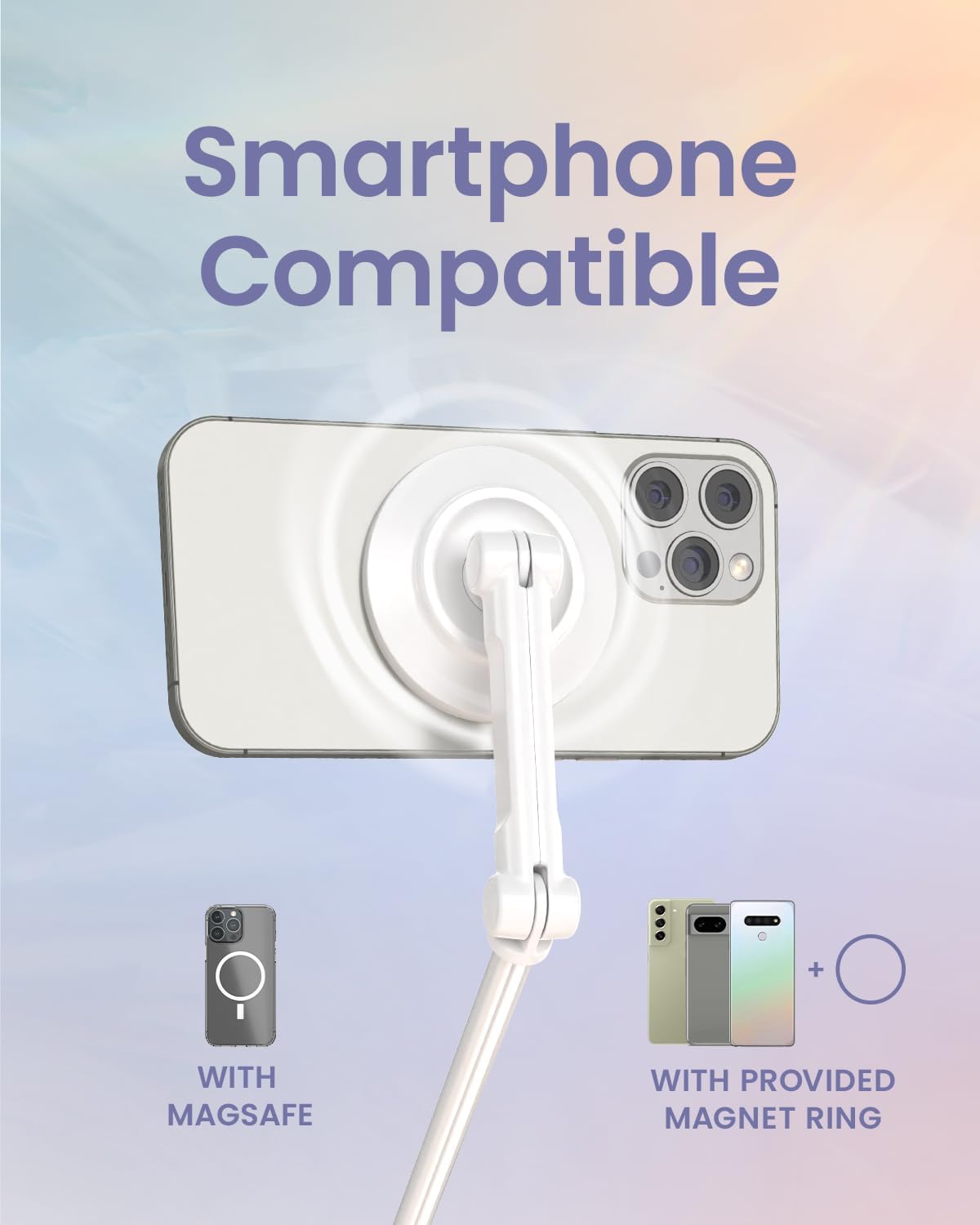- Strong Magnetic Phone Mount: Equipped with strong N52 magnets for secure, clamp-free attachment. This MagSafe tripod perfectly fits iPhone 12/13/14/15/16 series (including Pro, Max, and Mini), delivering a smooth snap-on experience every time. Includes metal rings for Android phones and non-MagSafe cases.