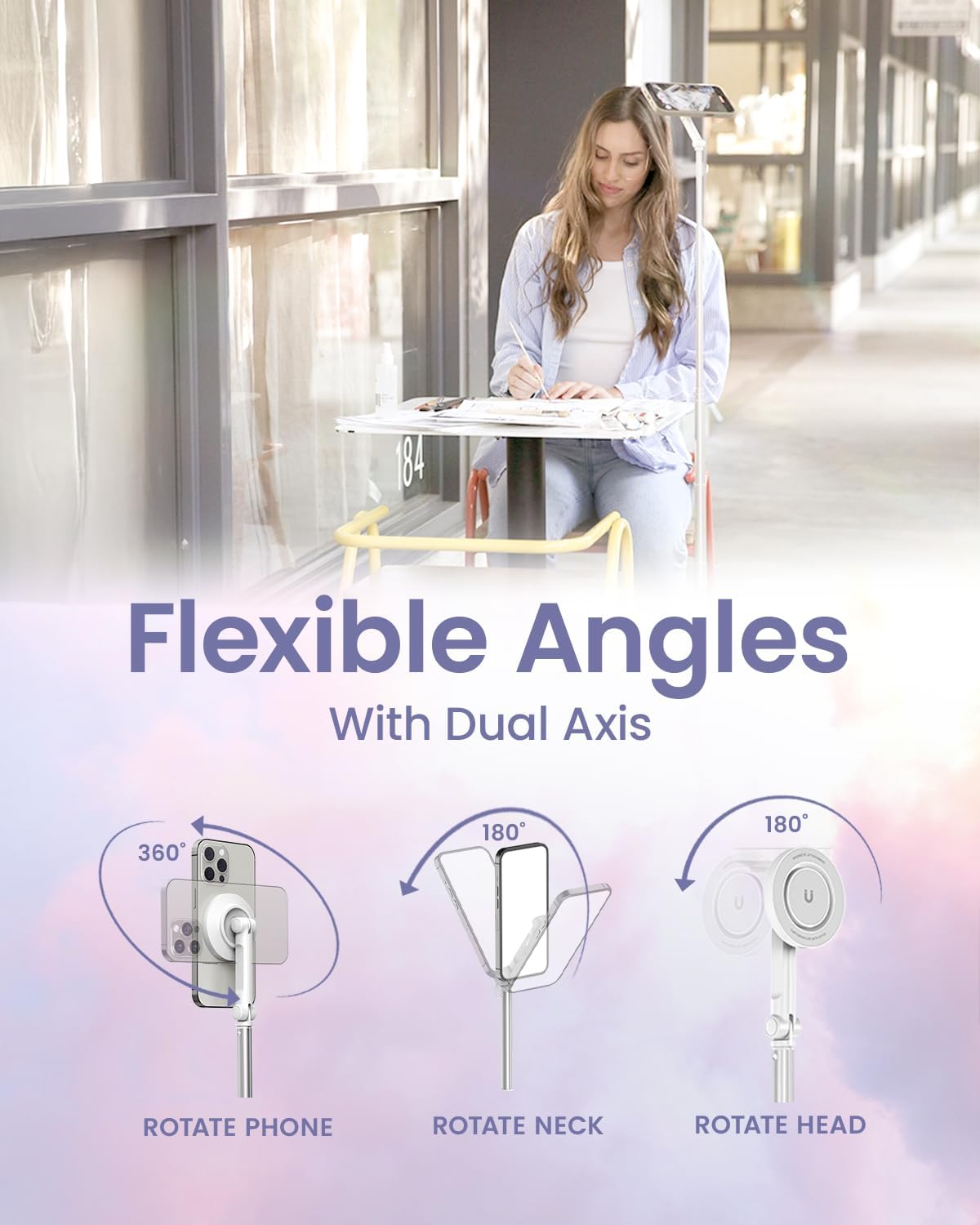 - Dual-Axis Adjustment: Two hinge joints provide smooth 180°tilt and effortless phone rotation. This adjustable magnetic phone tripod mount makes it easy to capture low angles, overhead shots, or switch orientations instantly-ideal for vlogging and content creation.