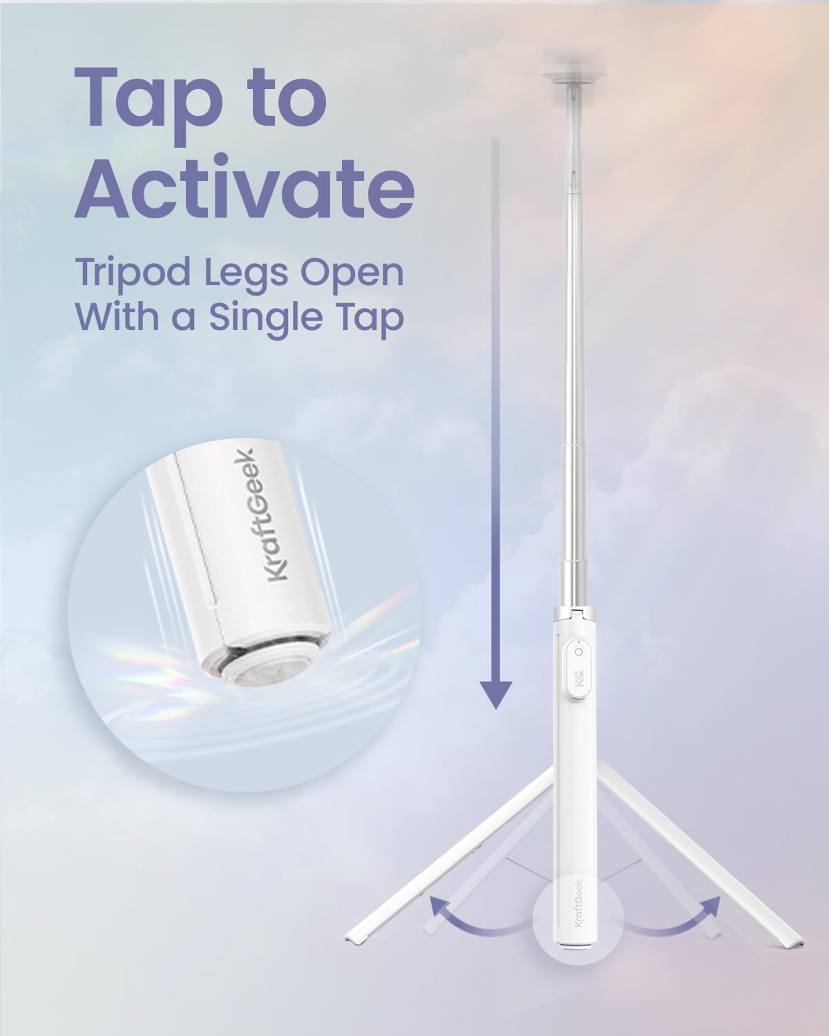 - Auto-Open Design, Fast & Nail-Friendly Setup: With a single tap, the KraftGeek JustTap Tripod instantly opens into phone tripod mode. This selfie stick tripod for iPhone is easy to set up one-handed and gentle on your nails — perfect for quick shots and filming.