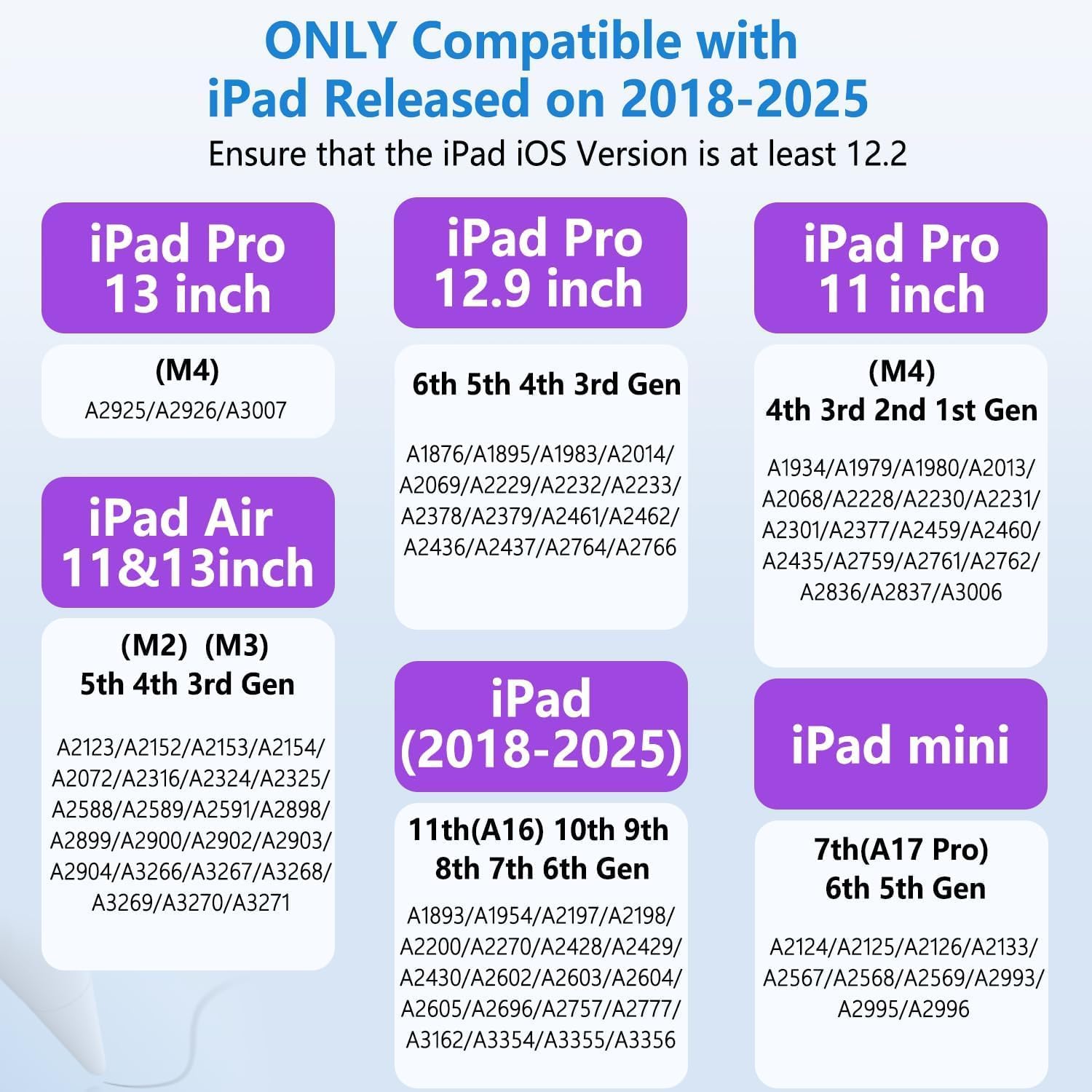- 【Compatible with 2018-2025 Apple iPad】The iPad Pen is ONLY compatible with following iPad model number. iPad Pro 13inch (M4), iPad Pro 12.9inch(3rd/4th/5th/6th), iPad Pro 11inch(All Generations), iPad Air M3/M2/5th/4th/3rd Gen, iPad 11th(A16)/10th/9th/8th/7th/6th, iPad Mini 7th(A17 Pro)/6th/5th Gen.