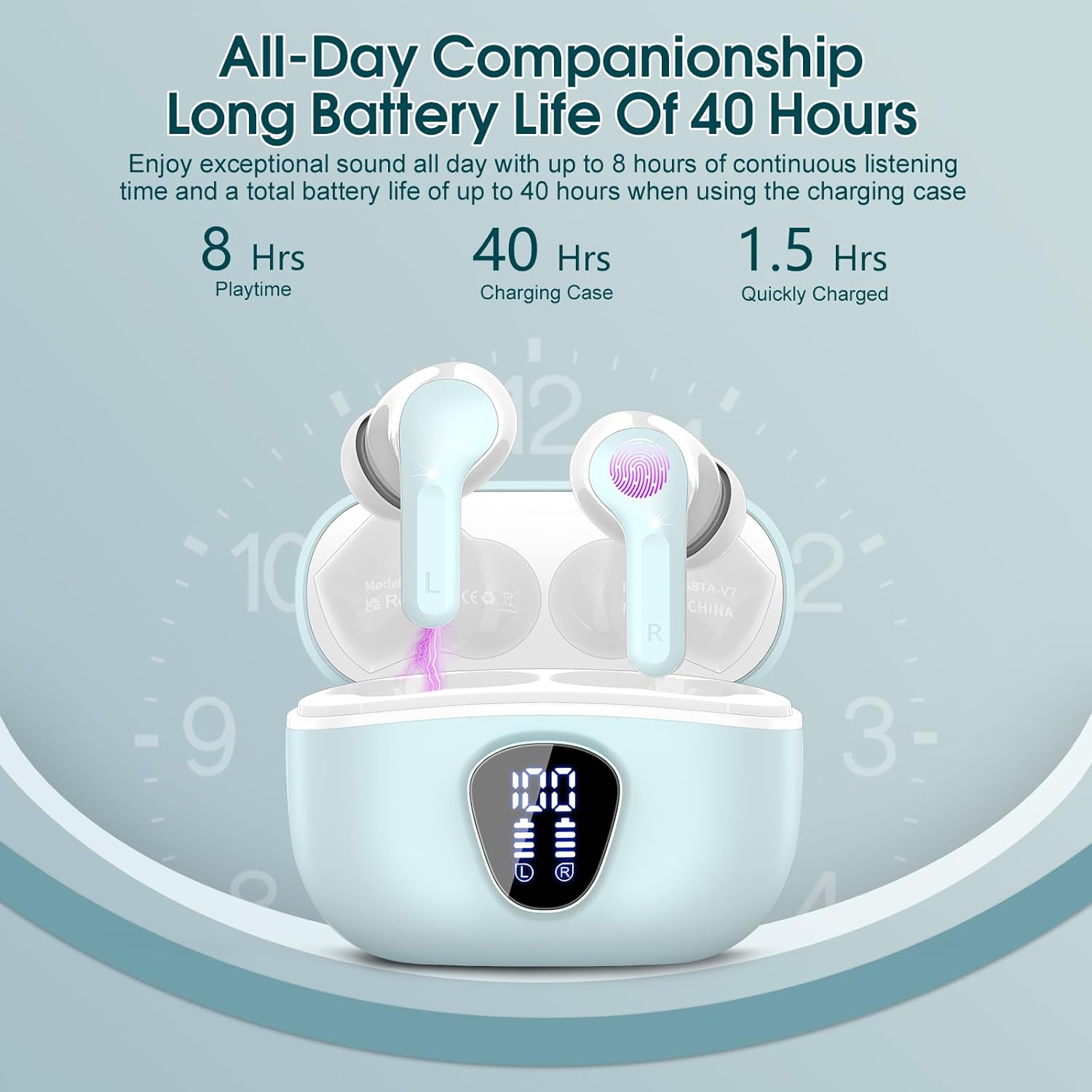 - 48H long-lasting battery life & dual LED digital display: Up to 8 hours of music playback on a single charge (1.5h only) with the charging box, this in ear headphones offers up to 48H of battery life, ensuring you can use it for a long time without frequent charging.The LED display clearly shows the battery level of the earbuds wireless bluetooth and the charging box, ensuring you always know the remaining power and enjoy an uninterrupted music experience during a long journey or a busy workday.