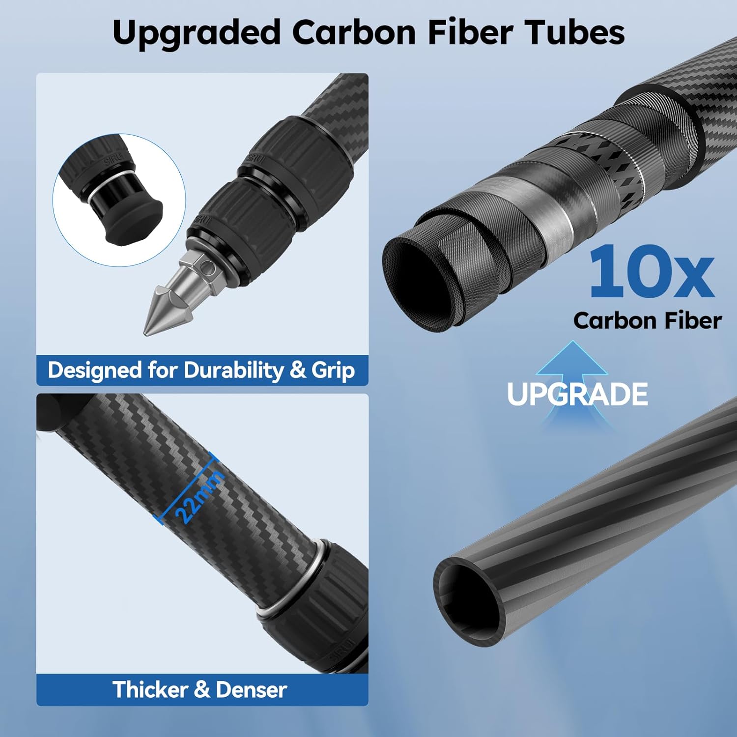 - [Premium Anti-Corrosion Carbon Fiber]-Newly upgraded carbon fiber tubes with aluminum alloy joints resist moisture and scratches, while keeping total weight at only 0.7kg (1.54lbs).