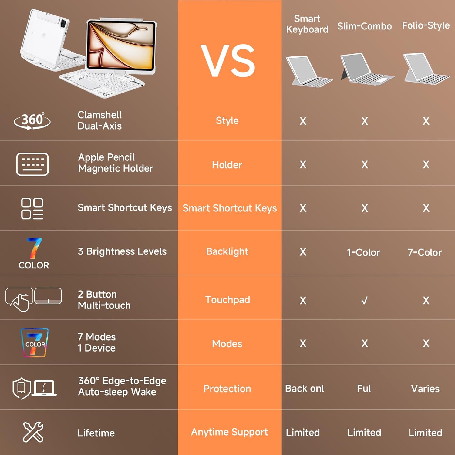 - 【Illuminated Typing + 7-Color Backlight】: This iPad Pro 12.9-inch and iPad Air 13-inch case with a keyboard features a 7-color backlit keyboard that allows for brightness adjustment, ensuring excellent typing in any lighting condition. It includes a full set of iPadOS multimedia shortcuts for easy volume and music control.