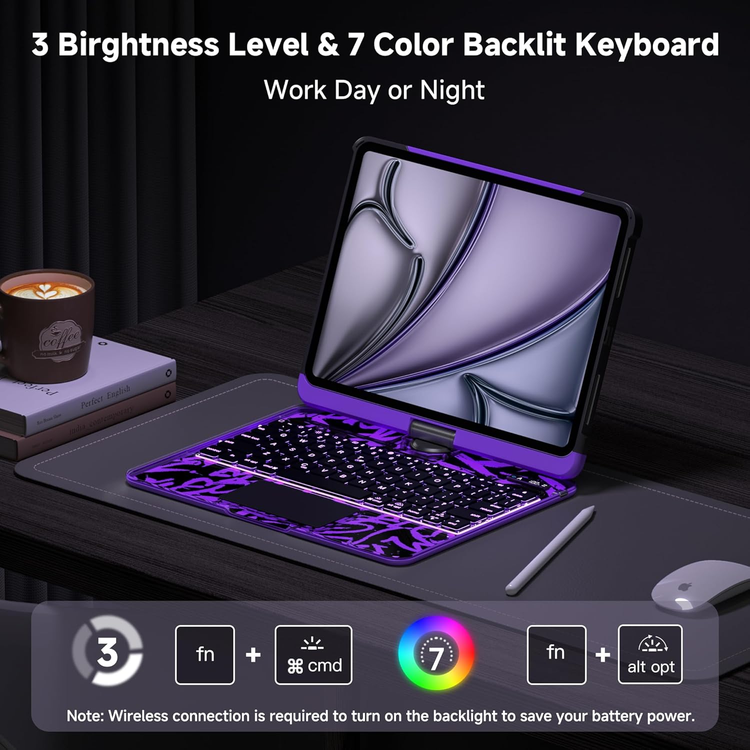 iPad Keyboard Case for 2024 M4 iPad Pro 13 inch, Magic Wireless Keyboard with Trackpad 7 Color Backlit, 360° Rotating Stand Transparent Protective Cover with Pencil Holder (Purple)