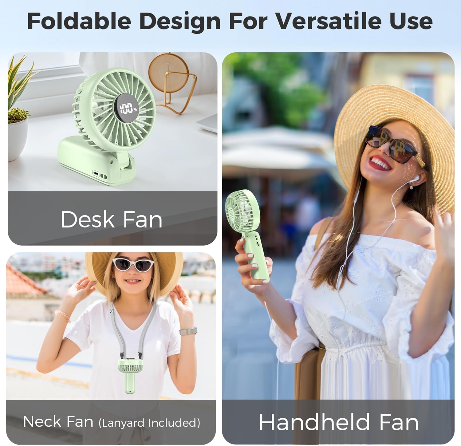 Portable Handheld Fan, 5000mAh Rechargeable Battery, Max 15H Cooling, 4 Speeds, LED Display, Foldable Design, 3-IN-1 Personal Pocket Fan with lanyard for Travel Outdoors Makeup Concert Commute