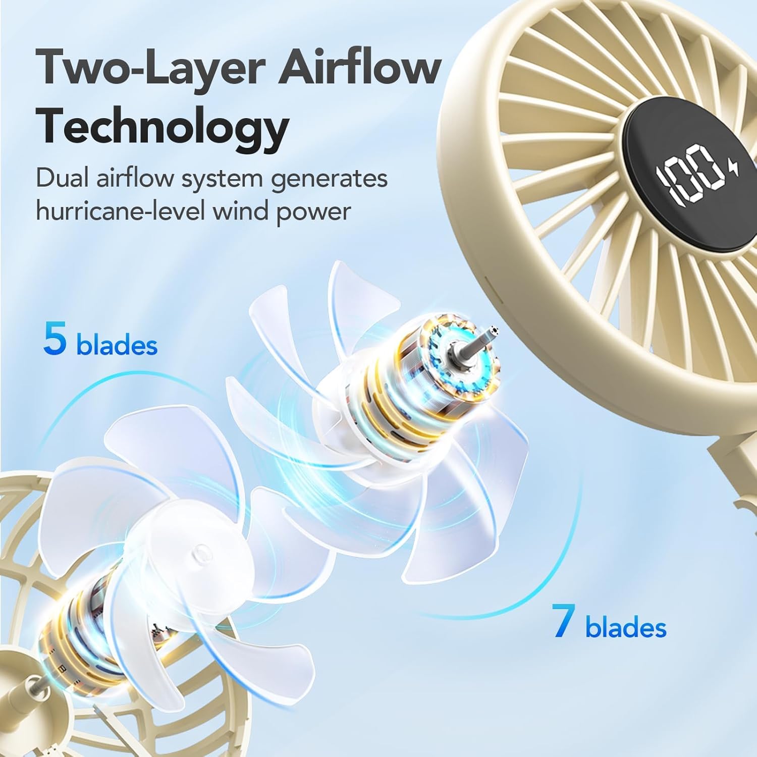 - Double-Layer Blade Design: Our handheld fan features an innovative double-layer blade system, combining 7-blade and 5-blade designs powered by an upgraded brushless motor. This configuration delivers powerful airflow, allowing you to customize your cooling experience with 4 Gear Wind function