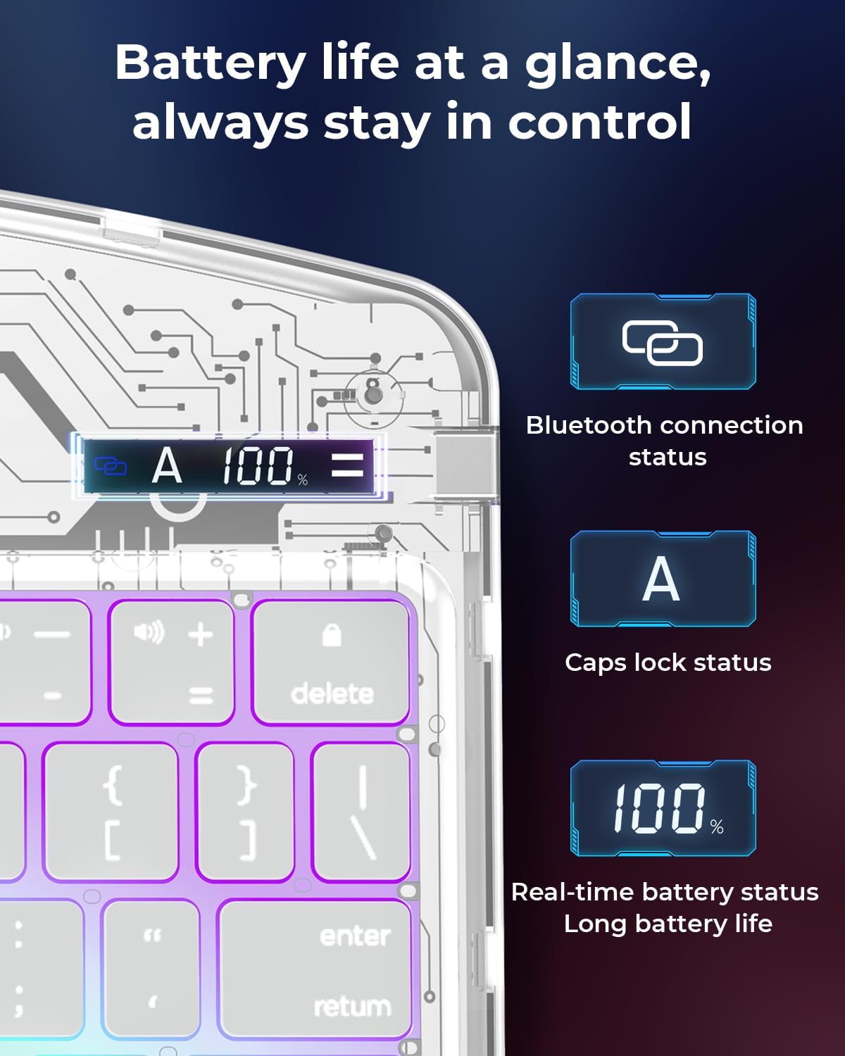 - Futuristic Aesthetic & 7-Color Backlit Keys: Features a tech-inspired transparent panel revealing intricate circuitry details, paired with 3-level brightness and luxe inspired 7-color glow backlighting for easy typing in low-light settings. Combines bold style with modern functionality.