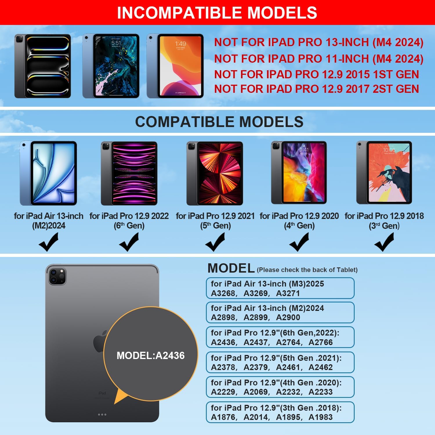 - Case Compatibility: Elevate your 2024 / 2025 iPad Air 13 inch or iPad Pro 12.9 experience with our versatile keyboard case. Compatible with iPad Air 13 inch 2024,iPad Pro 12.9 ( 6th/5th/4th/3rd gen), models include 2024 Air 13 inch(A2898 , A2899, A2900),2022 12.9 inch Pro 6th Gen(A2436 ,A2437, A2764, A2766); 2021 12.9 inch Pro 5th Generation (A2378, A2379, A2461, A2462); 2020 12.9 inch Pro 4th Generation (A2229, A2069, A2232, A2233); 2018 12.9 inch Pro 3rd Generation (A1876, A2014, A1895, A1983). We’re happy to help! Reach out to us if you need to check compatibility.