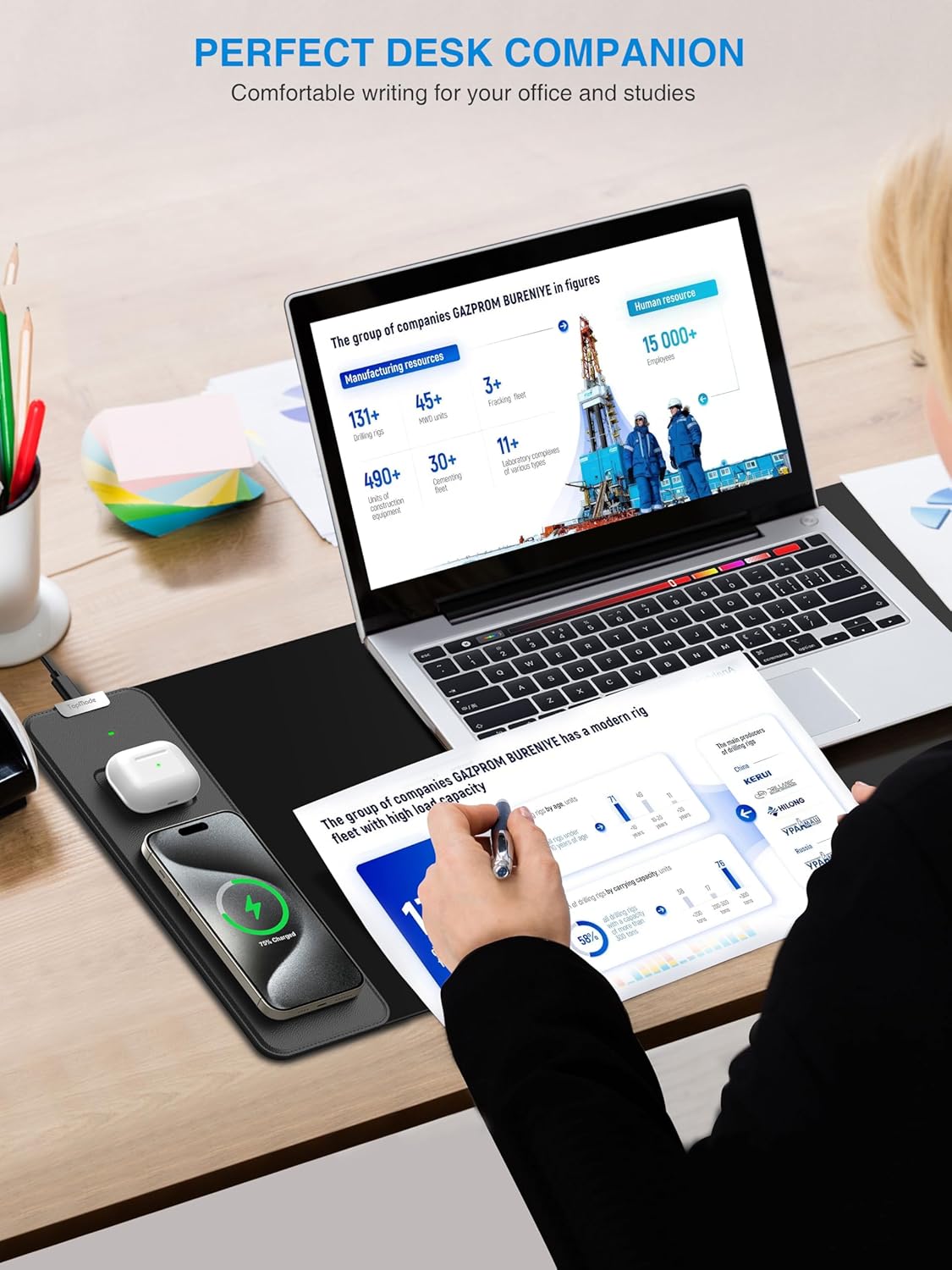 - 【XL Large 3-IN-1 Wireless Charging Mouse Pad for Desk】 TopMade XL mousepad is 31.5" x 11.81", the extra large usable area covers your desk keyboard, mouse, and other items while gaming or working, and combines 3 functions of phone charging, AirPods charging, and mouse pad in one, allowing you to charge your iPhone and AirPods while using the gaming mousepad without the need for additional cables interfering with your desk, keeping your desk neat and tidy