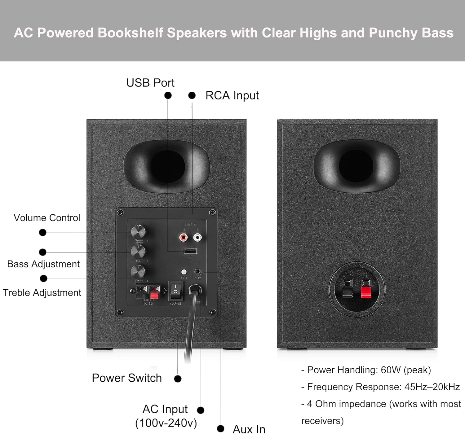 - Bluetooth 5.3 Connectivity & Multiple Connectivity Options: Latest Bluetooth technology for stable, high-quality wireless audio streaming with low latency and extended range up to 33 feet (10 meters). The bookshelf speakers feature multiple input options such as RCA and Auxiliary connection for seamless integration with PC, laptop, TVs, turntables, subwoofer, or gaming console.