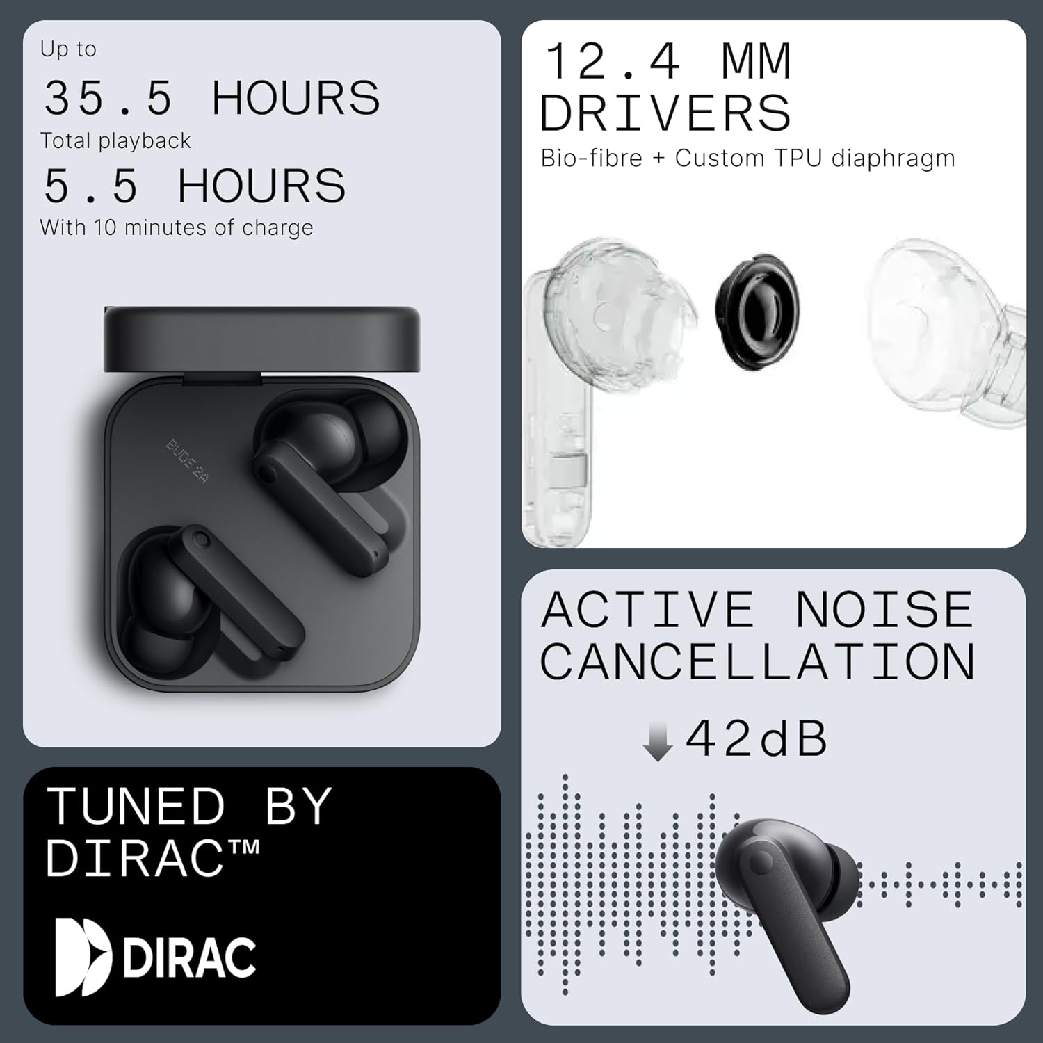 - DIRAC & Daily ANC - DIRAC, one of the renowned audio providers for luxury vehicles, now with CMF to co-tune, studio-grade 12.4mm Bio-fiber drivers provide a warm soundstage, rich mids and Crisp/Thundering bass(Allow Off/Custom). For daily listening, 42dB Smart Active Noise cancelling is decently tailored for your most common scenarios