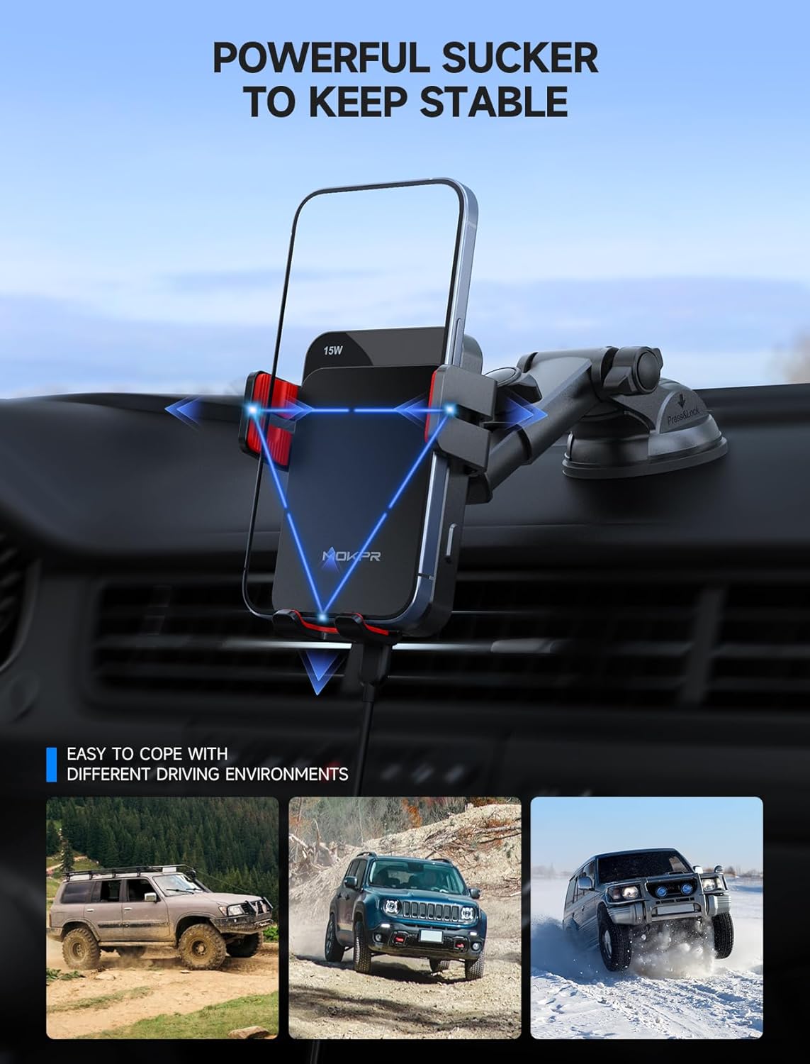- 【Latest Chip for More Efficient Charging】The MOKPR Wireless Car Charger is a built-in advanced sensor, just place your phone in after power on, it will intelligent identify your phone and Auto-adjusting phone to the best charging area and fast charge.