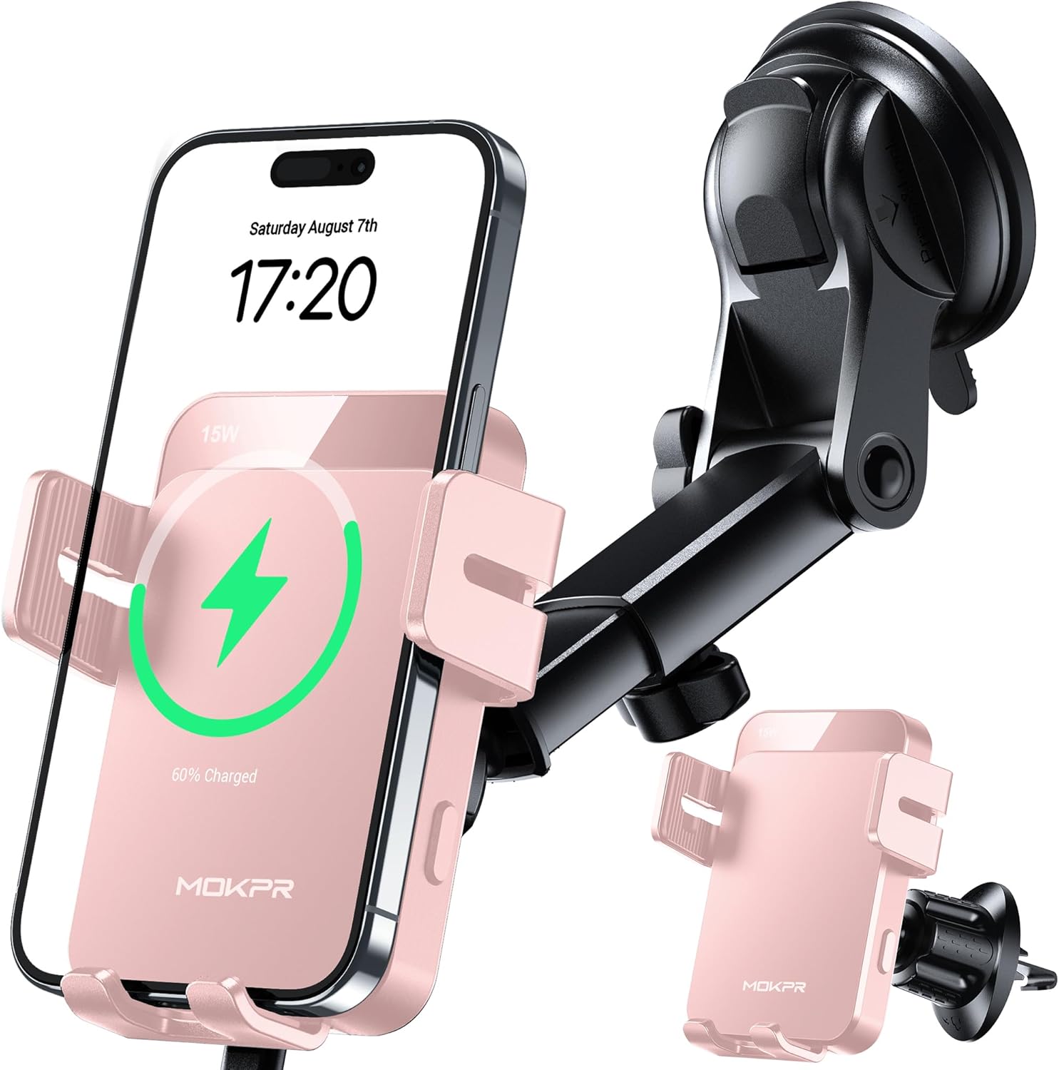 MOKPR Wireless Car Charger, 15W Auto Clamping Car Charger Dash Windshield Air Vent Phone Holder Compatible with iPhone 16 15 14/13/13 Pro/12 pro/12/11/X/8, Samsung S24/S23/S22, Pink