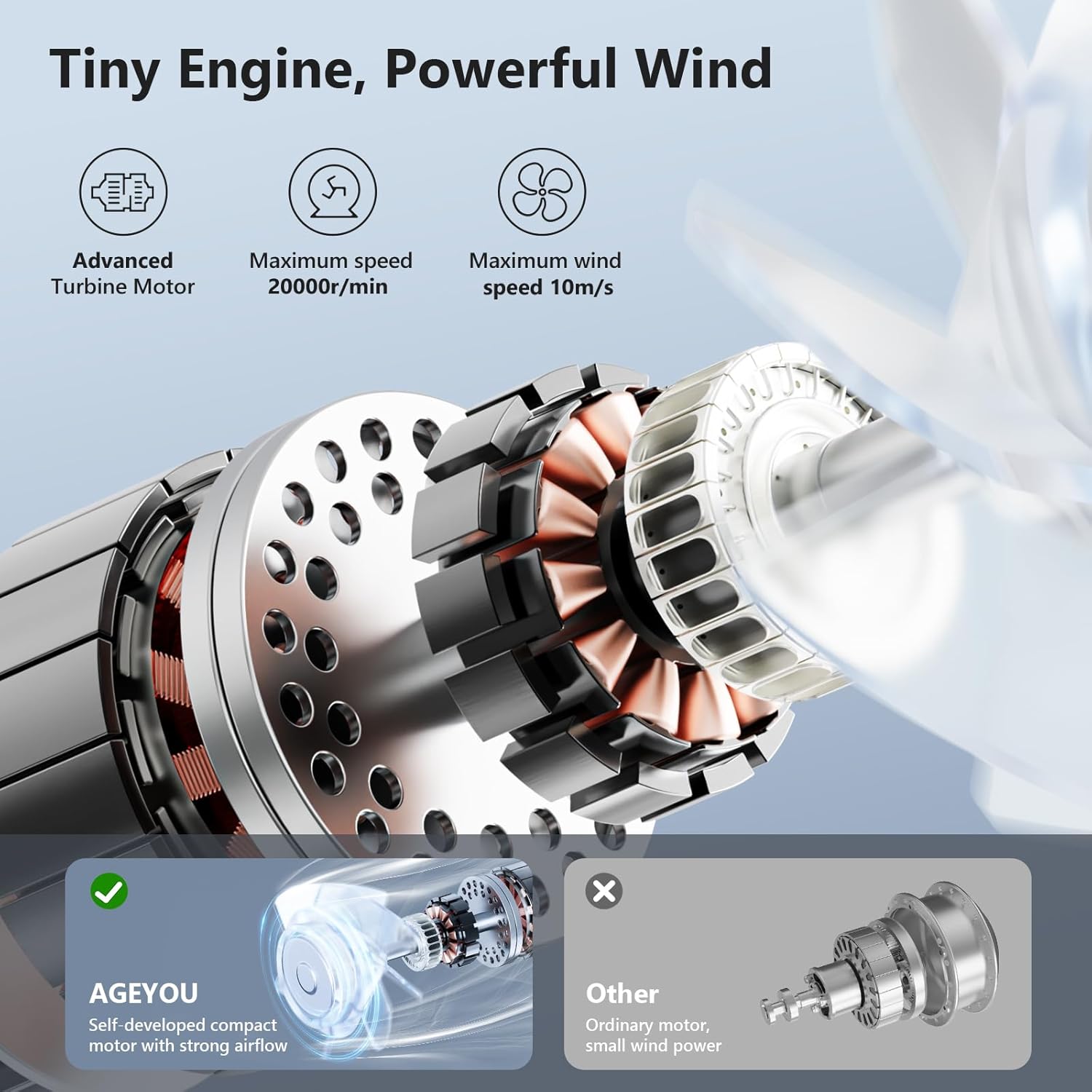 - 🌀[Brushless Motor - Super Power] The combination of 3-phase brushless motor and 4000mAh battery greatly increases wind speed, power and range. Maximum wind speed is up to 10m/s. The maximum speed of the handheld fan is three times higher than a normal personal fan, up to 20000 rpm. A single charge lasts for 3-15 hours of continuous cooling.