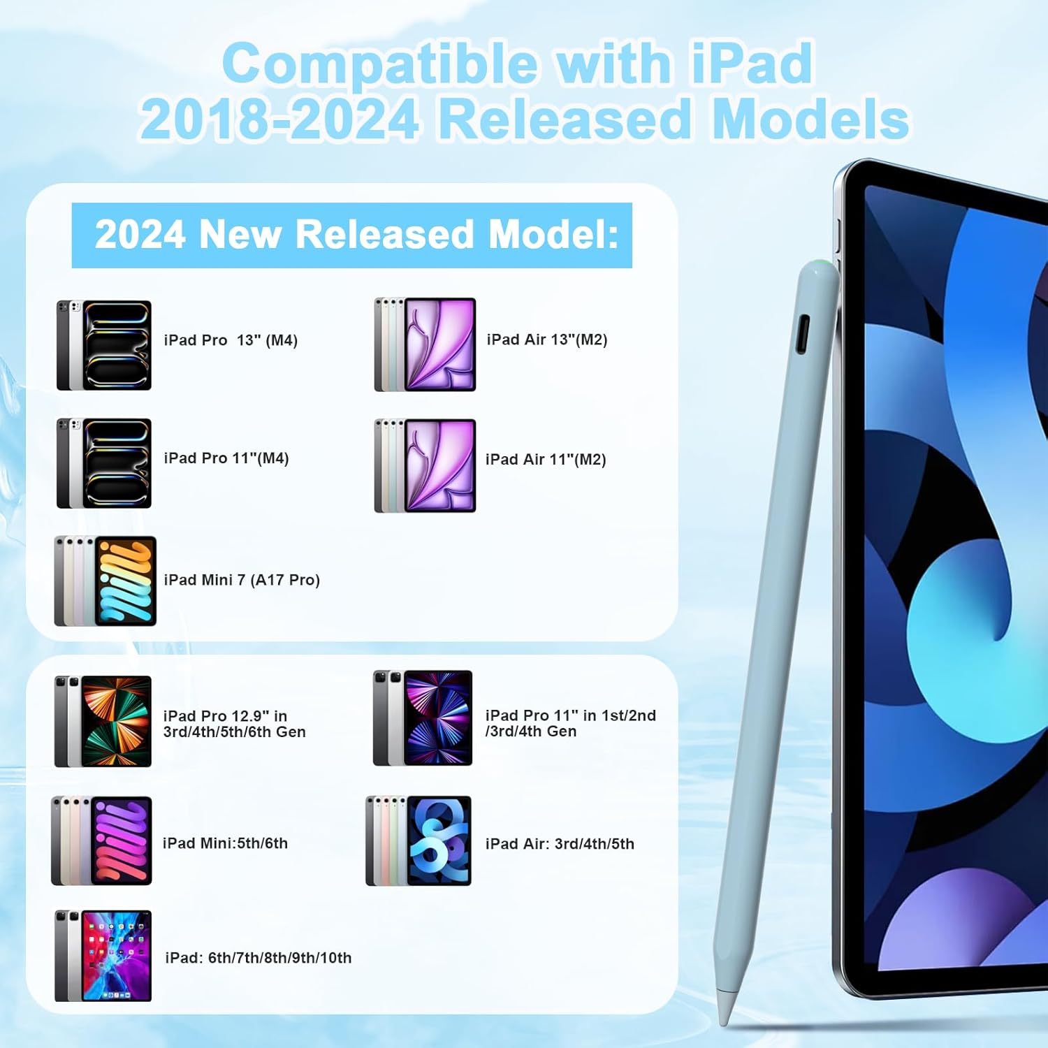 - USB-C Fast Charge Compatibility: Upgrade Stylus pencil Same as Apple Pencil 2nd Generation supports USB-C Fast Charge and Compatible With iPad 2018-2024 Model: iPad Pro 13”(M4)/12.9”/11”,iPad Air 6(M2)/5/4/3,iPad Mini 7(A17 Pro)/6/ 5,iPad10/9/8/7/6 and fully charging in 30 minutes and up to 8 hours of continuous use and Power display: Charging: green light breathes; Using: green light stays on; Less than 20% power: red light flashes