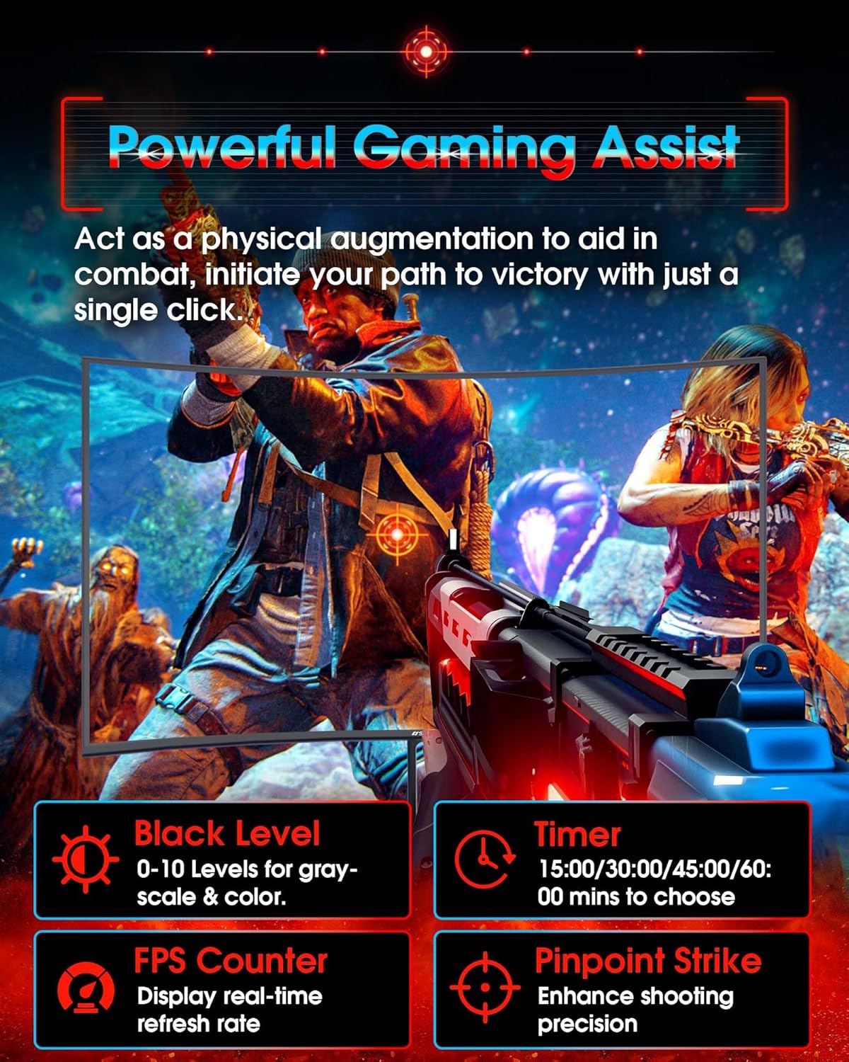 - Prioritizes Gaming Performance: Up to 240Hz high refresh rate, more immersive 1500R Curvature, FreeSync, MPRT 1ms Response Time, Black Level adjustment(shadow booster), Game Modes Preset, Crosshair.
