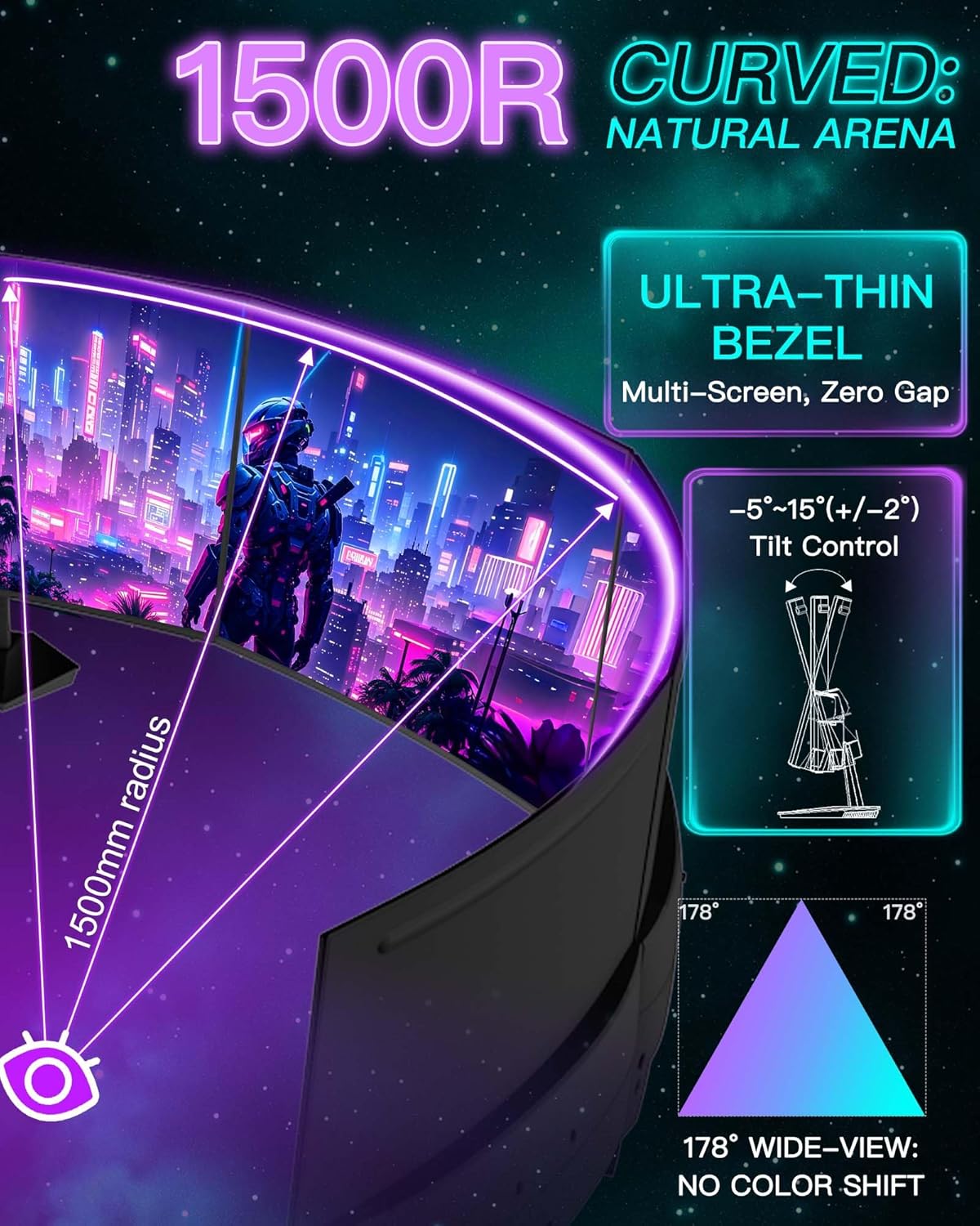 - Optimized Viewing: Up to 160Hz high refresh rate,1500R curvature reduces image distortion and eyestrain, more immersive. 1ms (MPRT) short response time, FreeSync & HDR Support.