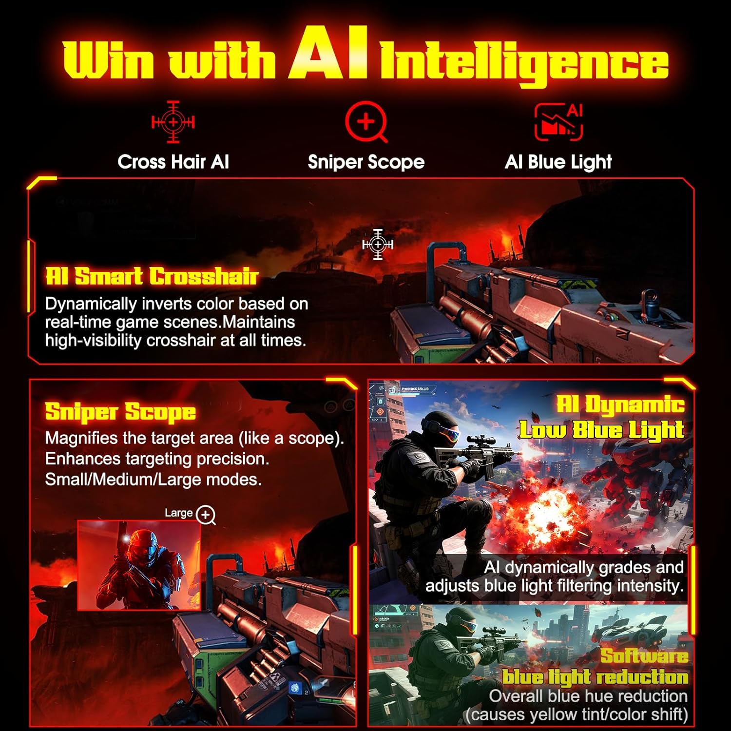 - Performance: 240Hz Refresh Rate | MRPT 1ms Response Time | Freesync | AI PQ(Visual Enhance) | Ultra Vivid(Weak/Middle/Strong) | AI Crosshair | AI Bluelight | Sniper Scope | Game Mode | VRR( Support xBOX,PS,Switch,can only be used when connected to HDMI2.1)